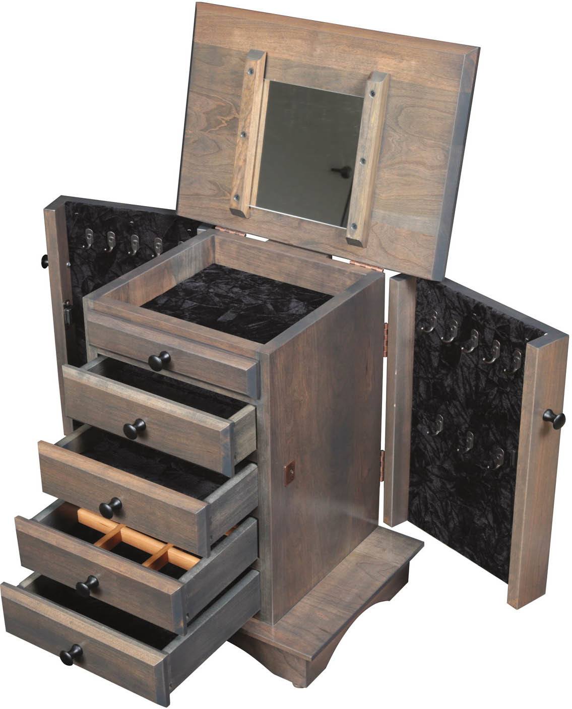 The 20-inch Shaker Dresser Top Jewelry Cabinet offers four drawers, a lift top, and a pair of wings. The top drawer contains a ring bar insert, and the second contains a bracelet holder. A wooden divider insert in the third drawer will help organize your smaller items. We lined the fourth drawer with velvet. The lift top reveals a mirror and additional storage space. The wings have eight jewelry hooks each, so you can keep necklaces untangled. Finally, choose from a wide range of the highest quality woods, stains, and hardware to create a look to fit your style. Please contact us so we can answer any questions and find exactly what you are looking for. It would be our pleasure to help you create the perfect jewelry cabinet for your home.