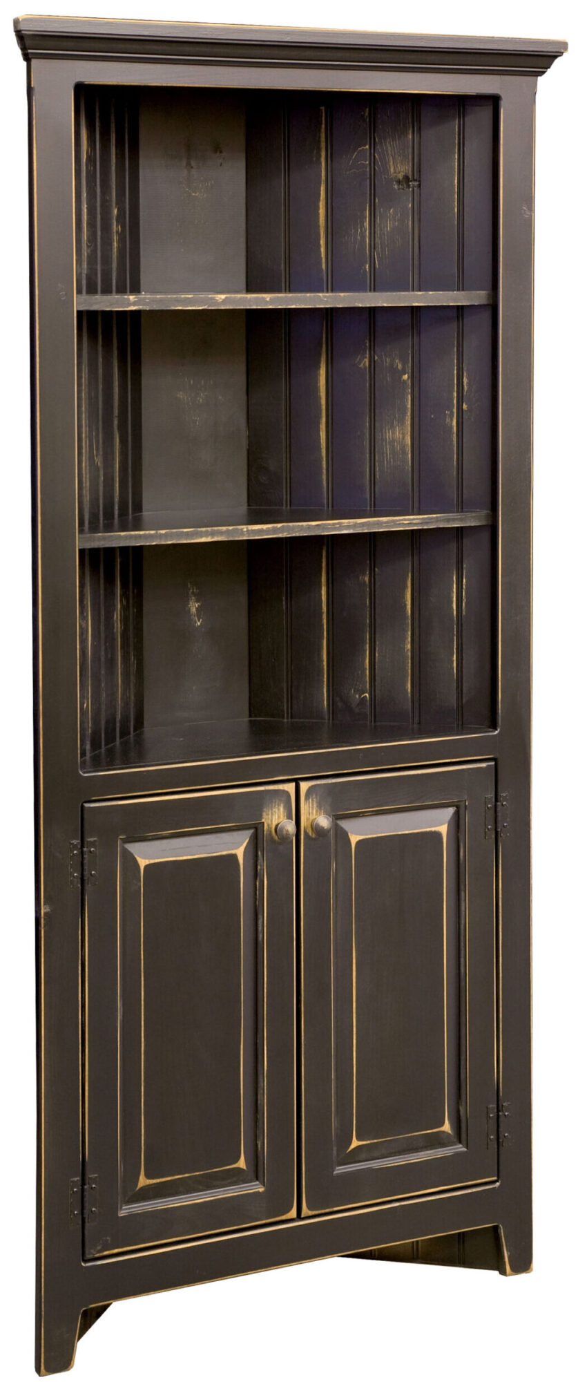 Upgrade a corner of your dining room or living room to one of elegance and practicality. Place the 35-inch Corner Cabinet there. The two shelves give you room to display some of your favorite plates, glassware, and/or figurines. Plus, you’ll find more storage behind the raised panel doors. Rustic elements enhance the look. Notice the visible saw marks plus the shiplap back and vintage finish. Our Amish cabinetmakers build the corner cabinet from solid hardwood. No wonder the piece is so good-looking, sturdy — and heirloom-quality! Now, make it yours. Simply fill out the open (blank) fields below. Also, make sure you tell us your choices for wood species, finish, and more. Or call/text 855-768-3270.