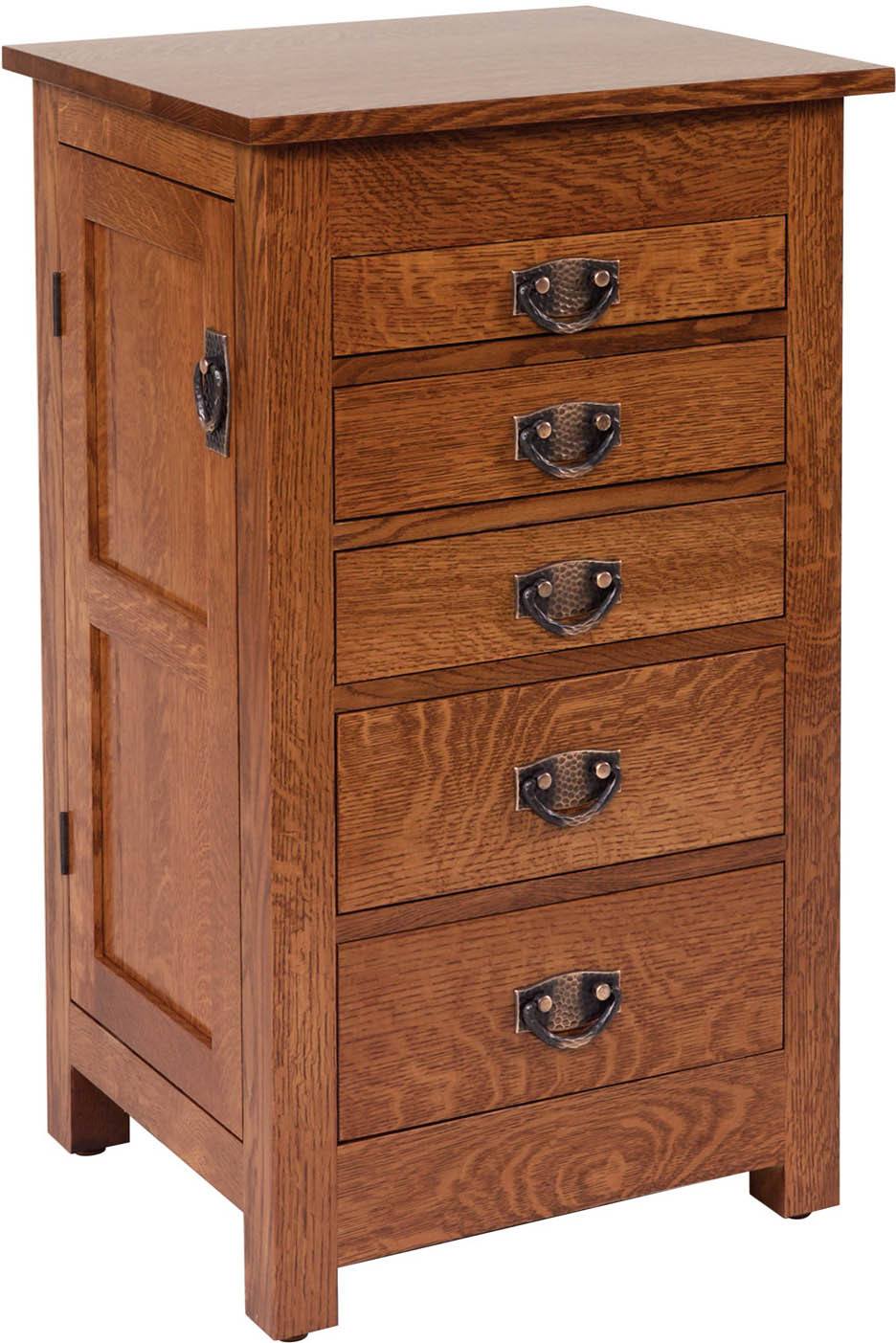 The 35-inch Mission Jewelry Armoire features five full-extension drawers.  So, you won’t lose precious items at the back of a drawer.  The top drawer contains a ring bar insert.  The second and third drawers have wooden dividers.  The larger fourth and fifth drawers have velvet-lined bottoms.  The wings on the 35-inch Mission Jewelry Armoire have eight jewelry hooks each and lovely paneled doors. We offer a variety of the highest quality woods, stains, and hardware.  If you don’t see exactly what you are looking for, please contact us so we can answer any questions.  We would love to make your dream a reality.  Your precious jewelry deserves to reside in a beautiful piece of furniture.