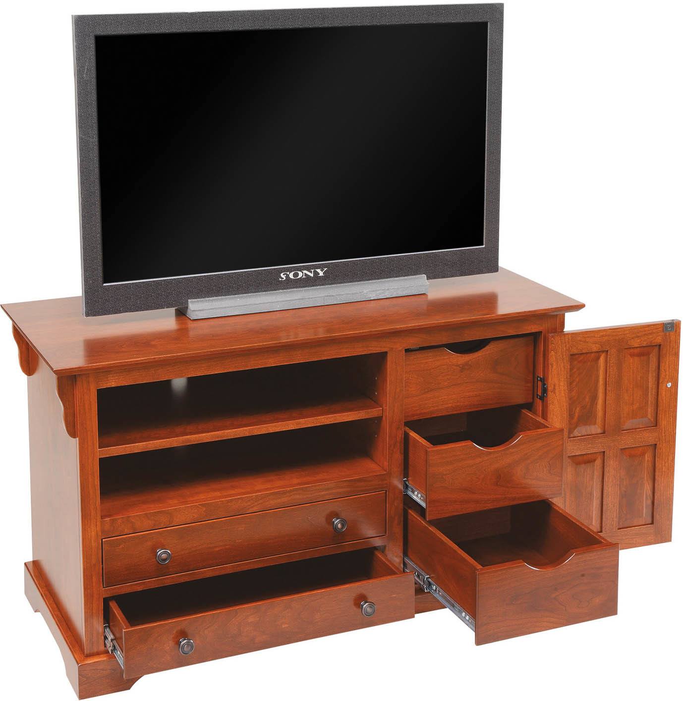 The 45 1/2 inch Mission Hills T.V. Stand offers ideal storage space for all of your entertainment accessories. In the left opening, an adjustable shelf makes the area especially suited for storing your receiver, DVD player, or other electronic equipment. The two large drawers give you a perfect spot for storing odds and ends, like extra cables or remotes. The lovely paneled door reveals three drawers with full extension slides. The full extension slides allow you to maximize the drawer’s capacity while still being able to access the back of the drawer. We have a variety of the highest quality woods, stains, and hardware from which to make your custom selections. If you don’t see the particular option you are looking for, please contact us so we can find exactly what you want or a suitable alternative.