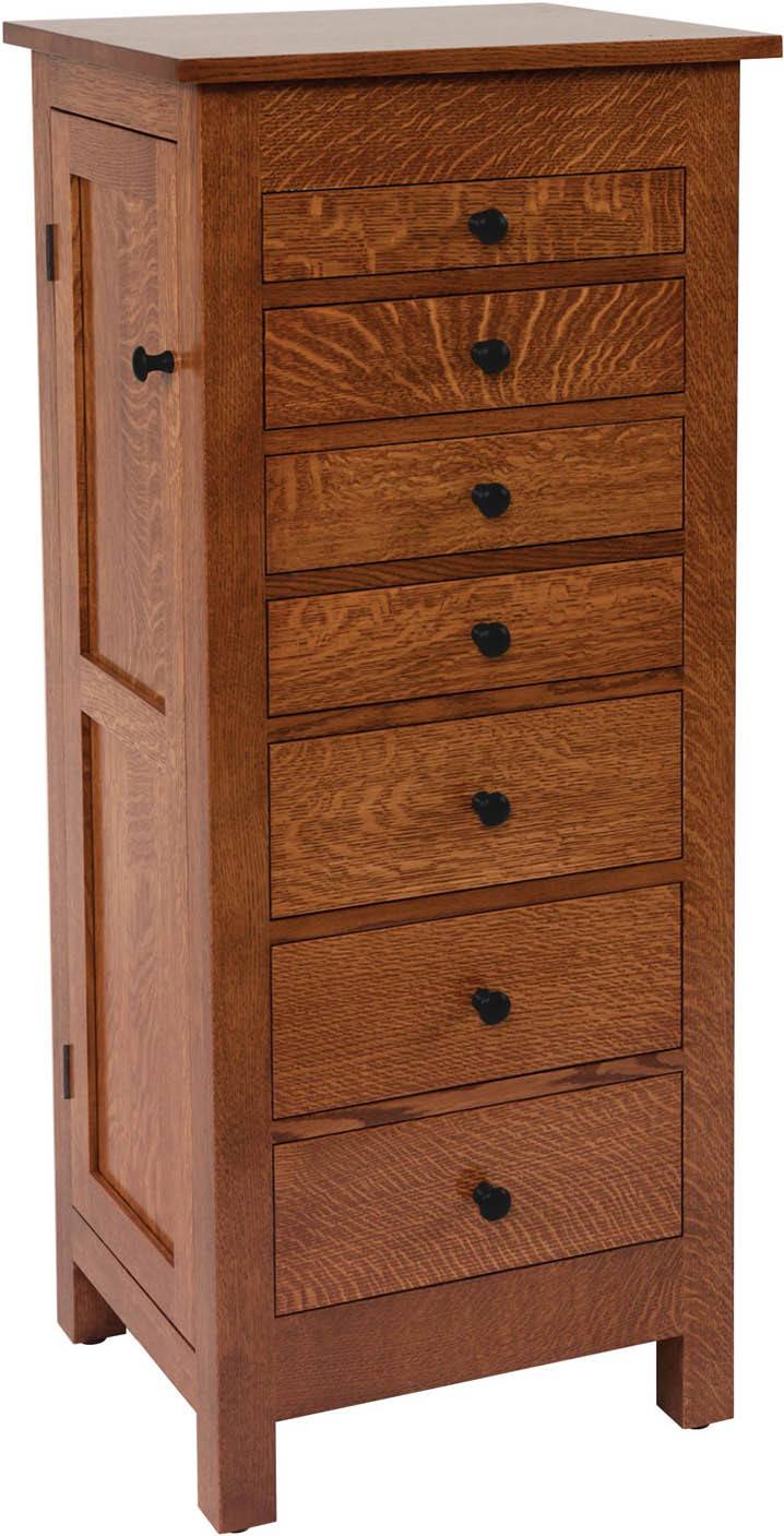 The 48-inch Mission Jewelry Armoire features seven full-extension drawers. So, you never need to worry about losing an earring in the back of a drawer. The top drawer contains a velvet-lined ring bar. The second through fourth drawers have velvet-lined, wooden dividers. Finally, the fifth through seventh drawers have a velvet-lined bottom. The wings on the 48-inch Mission Jewelry Armoire offer eight jewelry hooks each and lovely paneled doors. We offer a variety of the finest woods, stains, and hardware. If you don’t see exactly what you are looking for, please contact us so we can answer any questions and help you create the perfect jewelry cabinet.