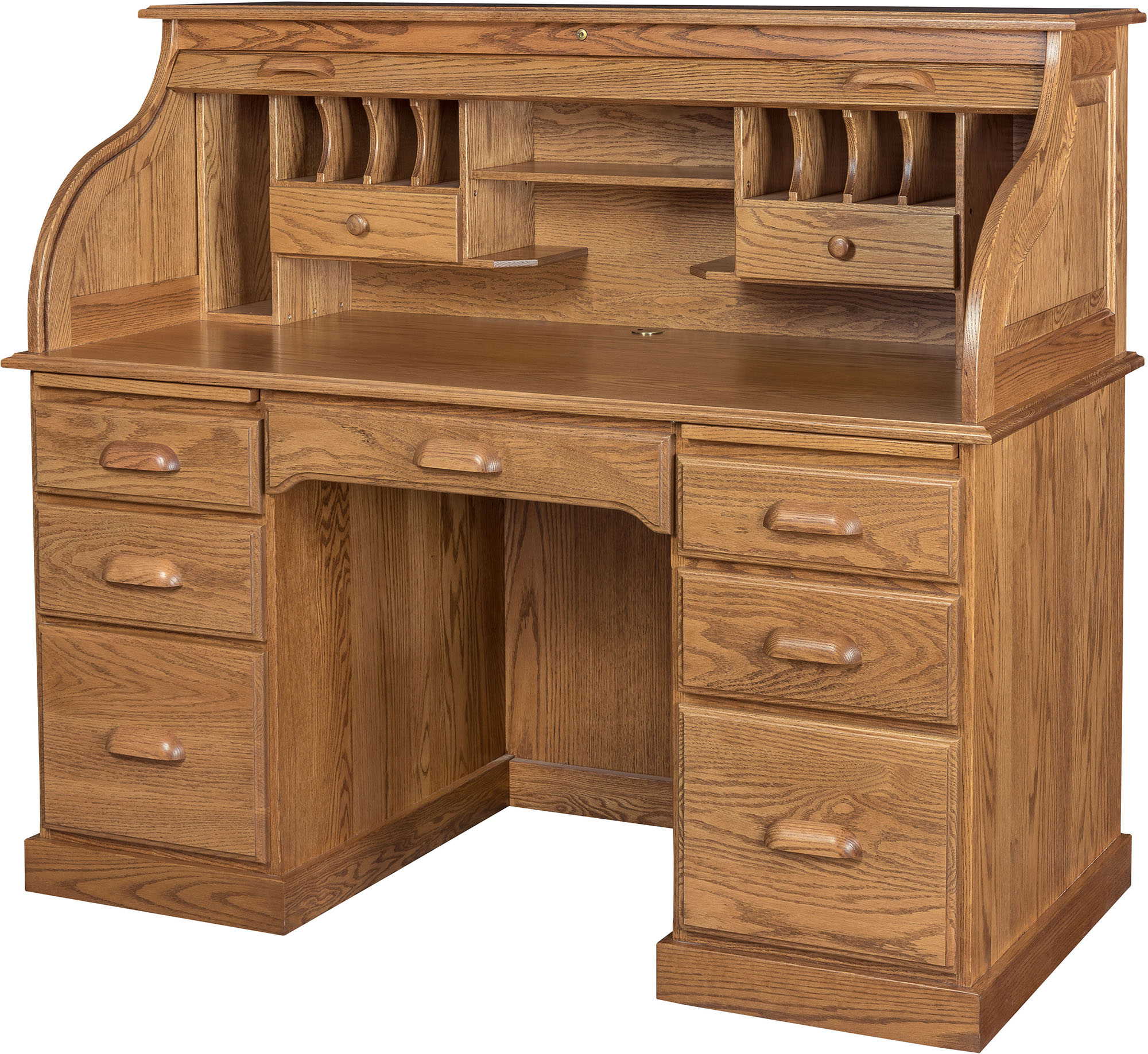 Here is a complete work station for your home office: the 56-Inch Roll Top Desk and Hutch. Roll up the tambour (flexible wood panel), and you get a large work area – complete with cuddies, shelves and drawers. They’re ideal for envelopes and miscellaneous office items. The drawers open full-extension for easy access to your files and office supplies. And the dovetail drawer joints are unsurpassed in strength. Plus, you can roll down and lock the tambour, keeping your desktop and credenza items secure. The hutch features lots of shelf space to stow and display your books and figurines. Our Amish cabinetmakers handcraft the desk and hutch. And they use top hardwoods like oak and maple. No wonder the desk and hutch are heirloom-quality! Now, make the unit yours. Simply complete the customizing fields below. Also, make sure you include your choices for wood species, finish and more. Or call 855-768-3270.