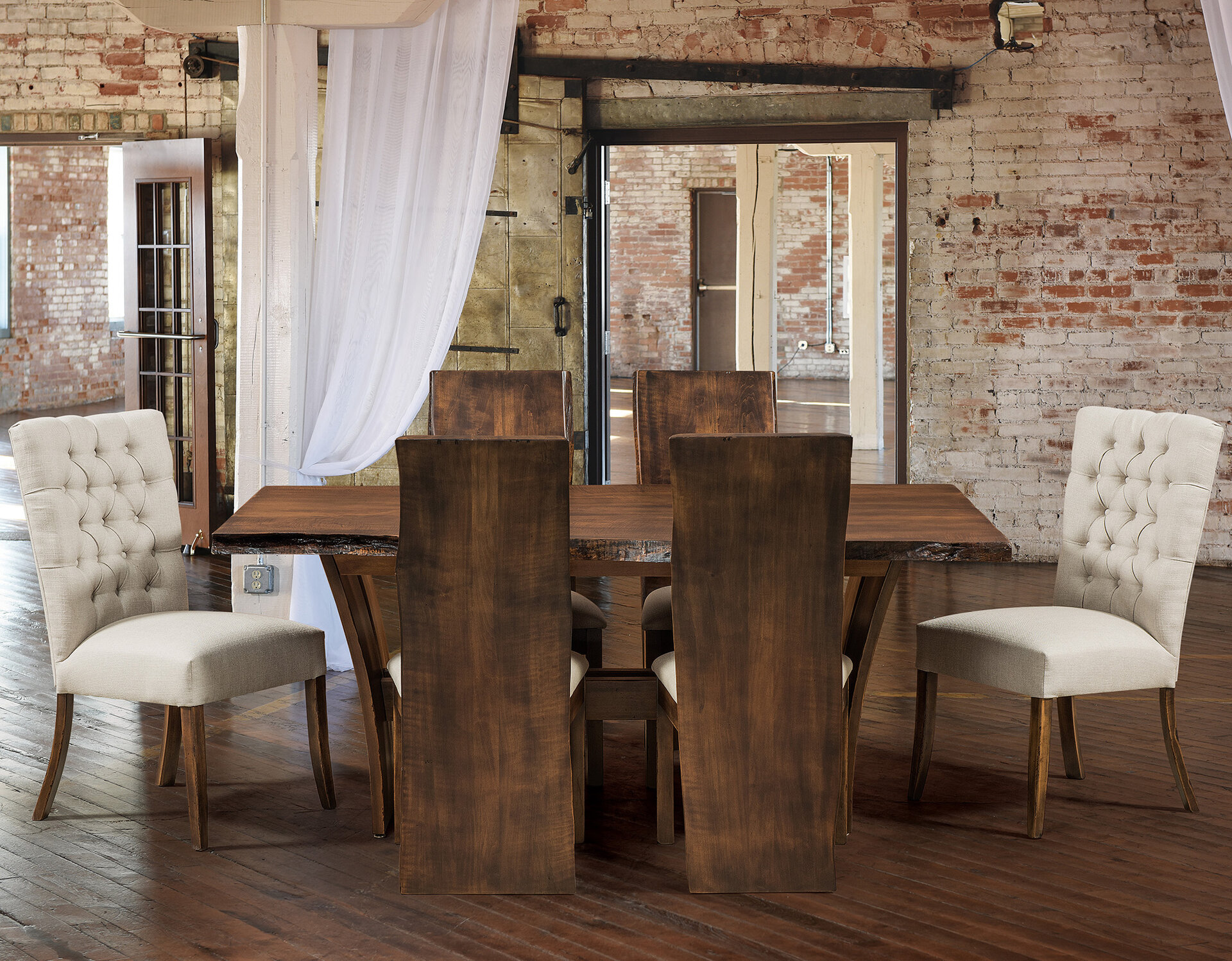 The Alana Dining Chair boasts strong construction and modern design. The Alana Dining Chair features a tufted fabric seat and beautiful wood legs so it boasts elegant sophistication. It is shown in Brown Maple with CF 7992 Asbury stain with a fabric seat crafted in lovely Linen fabric. Like all of our Dining Chairs, the Alana Dining Chair can be customized. Your choice of stain color and wood species and the selection of designer fabric or leather covering so it can always match your style.