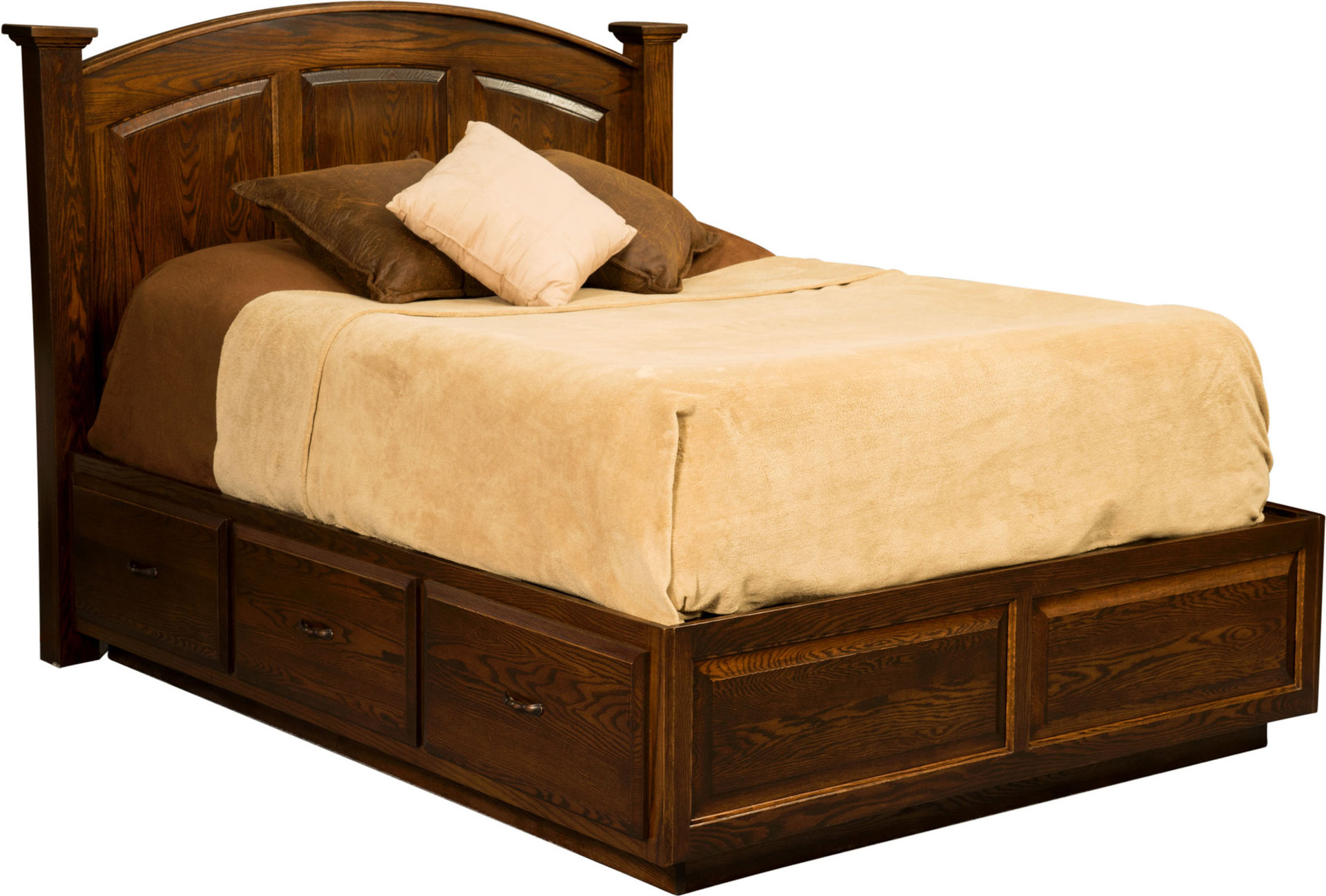 A curved headboard design, accentuated by raised panels and elegant posts, set the Americana Platform Bed aside for its eye-catching appeal. Indeed, the raised panels carry over into the six drawers, three on each side. Plus the footboard. You couldn’t ask for a more ornate platform bed! The dovetail drawer joints enhance strength. Amish artisans build the bed. Also, they use top hardwoods. Such as oak, maple and cherry. No wonder the bed is so sturdy. Durable. Also heirloom-quality! Now, make it yours. Simply fill out the fields below. Also, make sure you tell us your choices for wood specie, finish and more. Or call 855-768-3270.