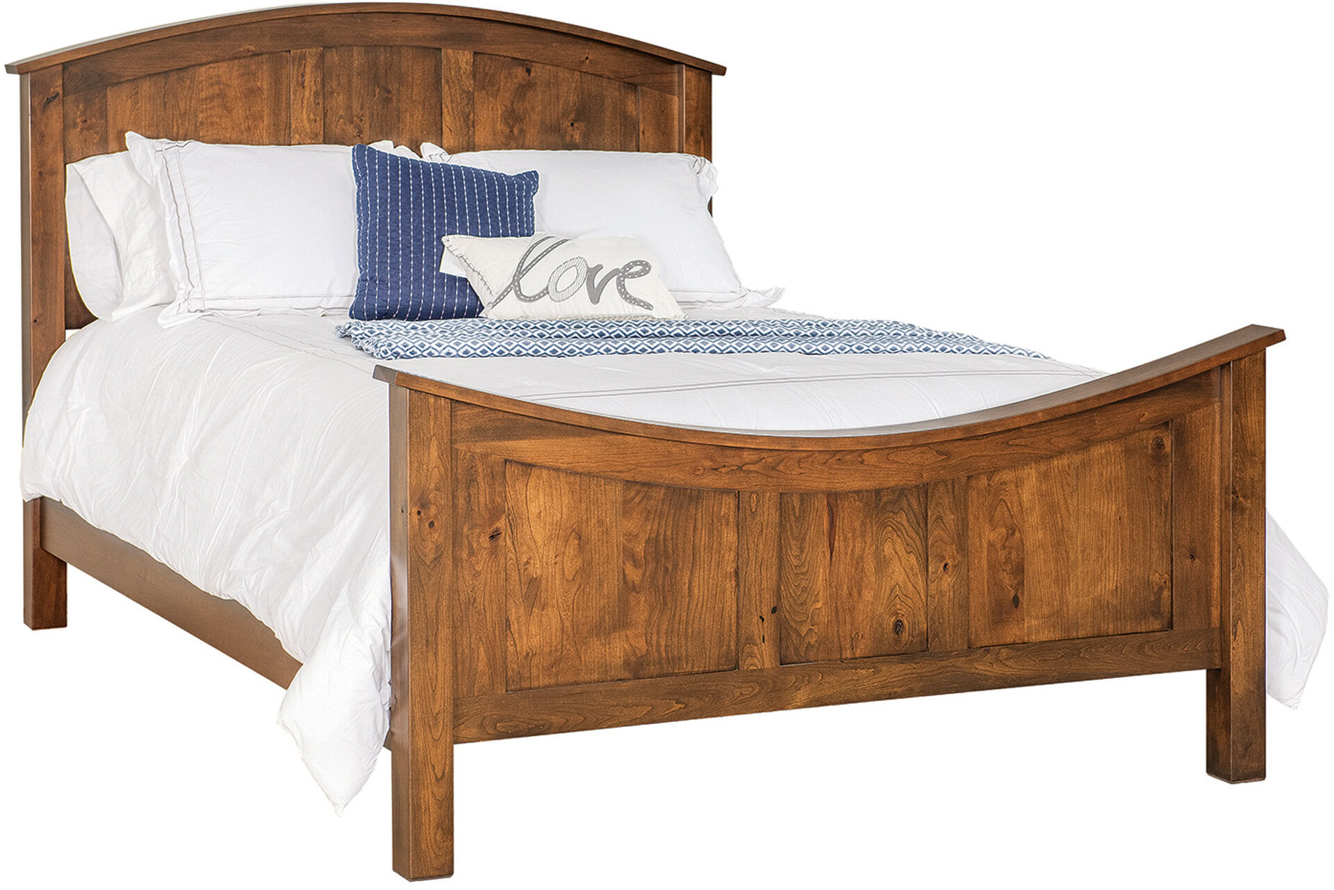 With its curved headboard and bowed footboard, the Amish Bow Bed will gracefully enhance your bedroom. Also, notice the flat panels and hefty, 3×3-inch posts. Because they reflect the superior Amish solid hardwood construction. Including mortise and tenon joints. What’s more, our Amish cabinetmakers use top regional hardwoods. Like oak, rustic cherry (shown), and hickory (also shown). So this Bow Bed is heirloom-quality! We offer the bed in king, queen, full, and twin sizes. Now, make it yours. Simply complete the customizing fields below. With your choices for wood species, finish, and more. Or call 855-768-3270.
