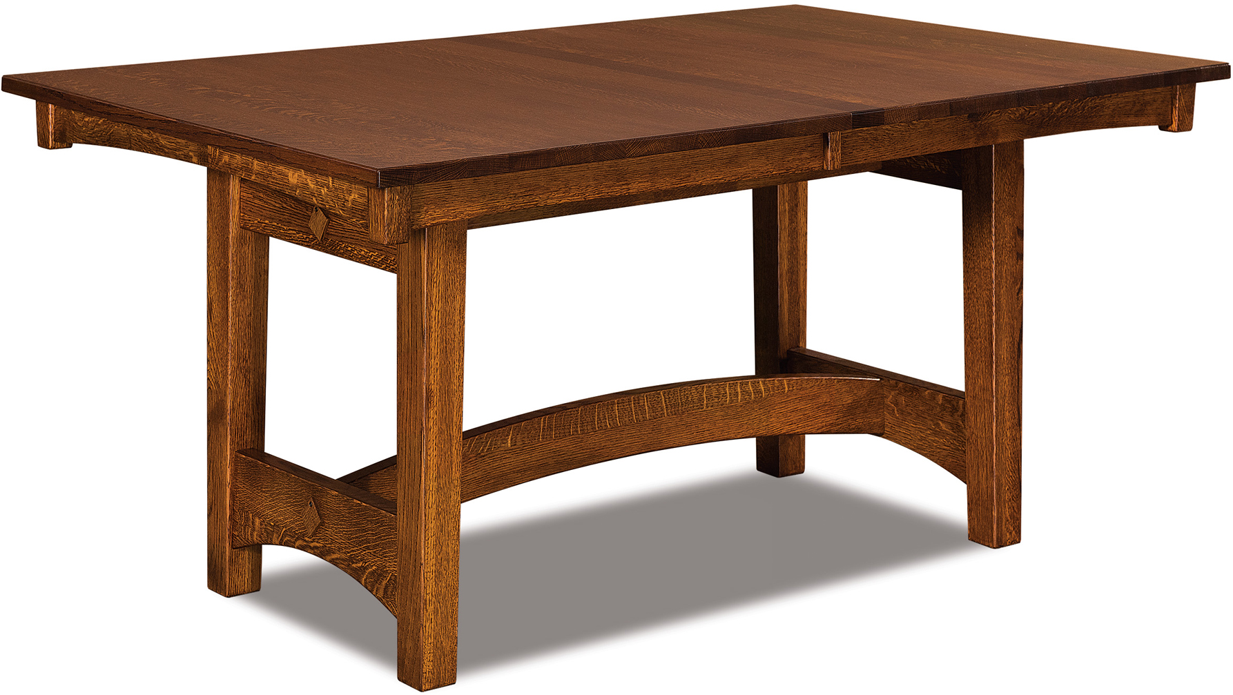 A hefty trestle base with a curved crossbar catches the eye in the Arts and Crafts Dining Table. Also, the 1-inch-thick solid hardwood top reinforces the quality of the table. So it will enhance the upscale look of your dining room. We offer the table in widths of 42 and 48 inches. Also lengths of 60, 66, and 72 inches. So you can choose the size that best meets your needs and desires. Wish to extend the table? Simply request up to four leaves. They even self-store below the tabletop. Our Amish cabinetmakers handcraft each Arts and Crafts Dining Table. Also, they use top hardwoods. Such as quarter-sawn oak with Michael’s Cherry stain (shown). No wonder the table is so sturdy and heirloom-quality! Now, make it yours. Simply complete the customizing fields below. Also, make sure you include your choices for wood species, finish, and more. Or call 855-768-3270.