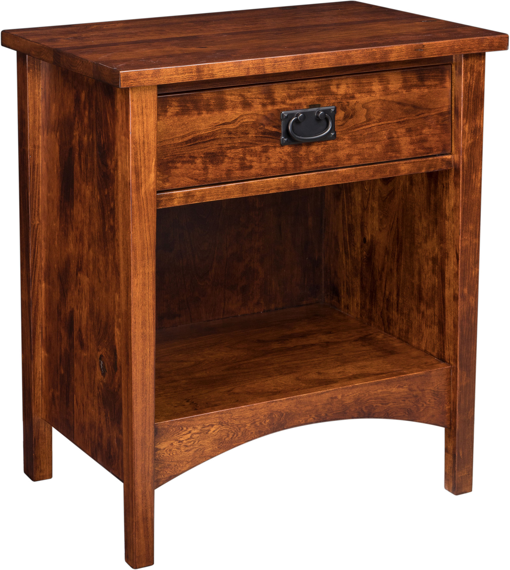 The stately elegance of the Mission design combines with practicality and legendary Amish construction to make the Arts and Crafts One Drawer Nightstand a remarkable find. The clean lines, flush drawer, burly persona and black Mission pull hardware speak to the unit’s Mission heritage. While the open bay keeps bedside items close to hand. What’s more, the drawer opens full-extension. This means easy access to everything inside. Even items at the back. While dovetail drawer joints enhance strength. Our Amish cabinetmakers build the nightstand. And they use top hardwoods, like maple and quarter-sawn white oak (shown with Michael’s Cherry stain). No wonder the piece is so beautiful, sturdy and heirloom-quality! Now, make it yours. Simply complete the customizing fields below. Also, make sure you include your choices for wood specie, finish and more. Or call 855-768-3270.