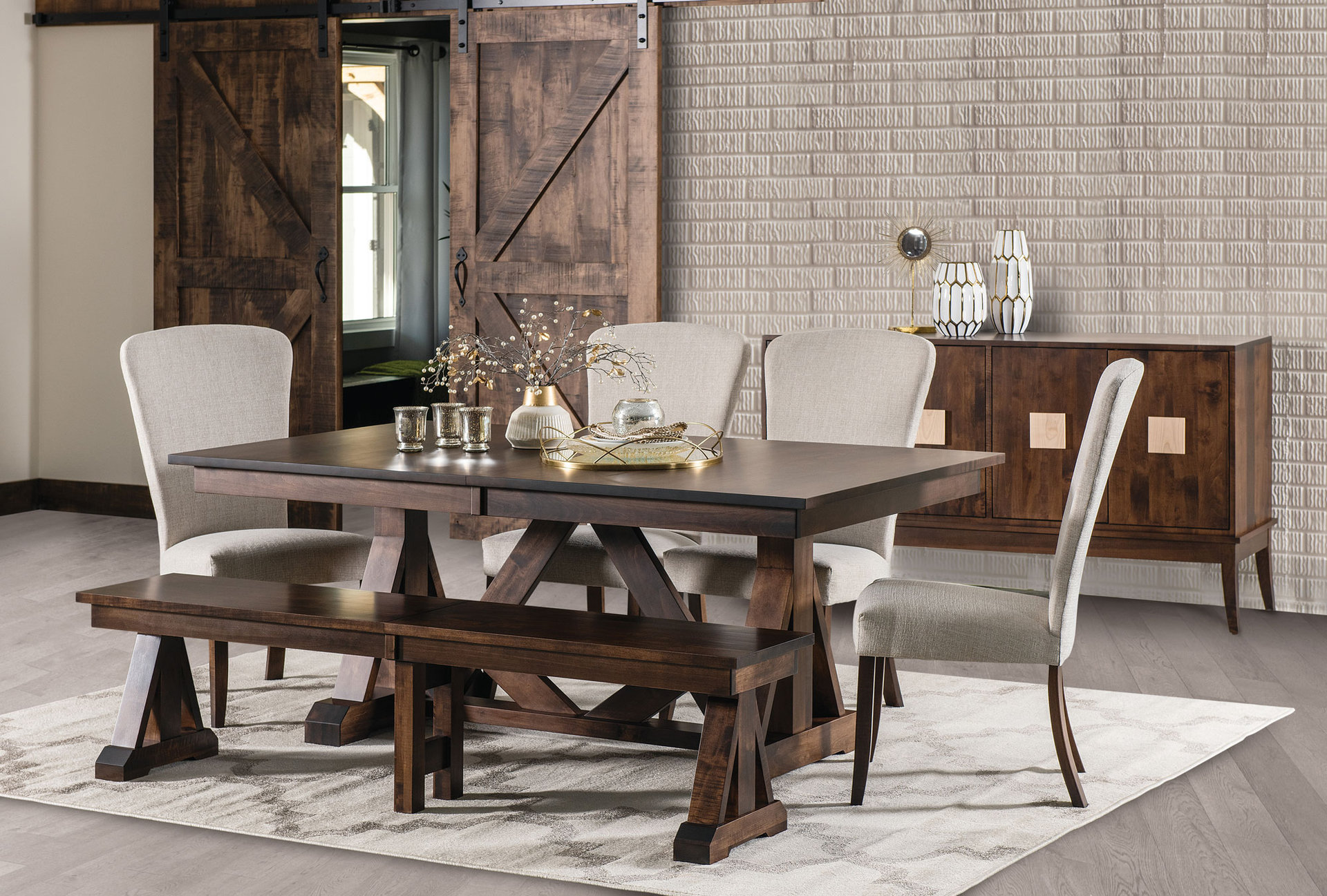 Here’s a dining table set that represents the ultimate in sophistication and comfort: The Bailey Trestle Table Set. Notice the grand design of the easel-like trestles and hefty posts. Also, the fully upholstered chairs excel in comfort and upscale looks. The table is available in several sizes. What’s more, the geared equalizer slides make it easy to extend the tabletop and add leaves, which self-store with most table sizes. Our Amish cabinetmakers build the set from brown maple (shown with Earthtone 10 Sheen) plus other top-quality materials. No wonder the set is so sturdy and heirloom-quality. Now, make it yours. Simply complete the customizing fields below. Also, make sure you include your choices for wood species, finish and more. Or call 855-768-3270.