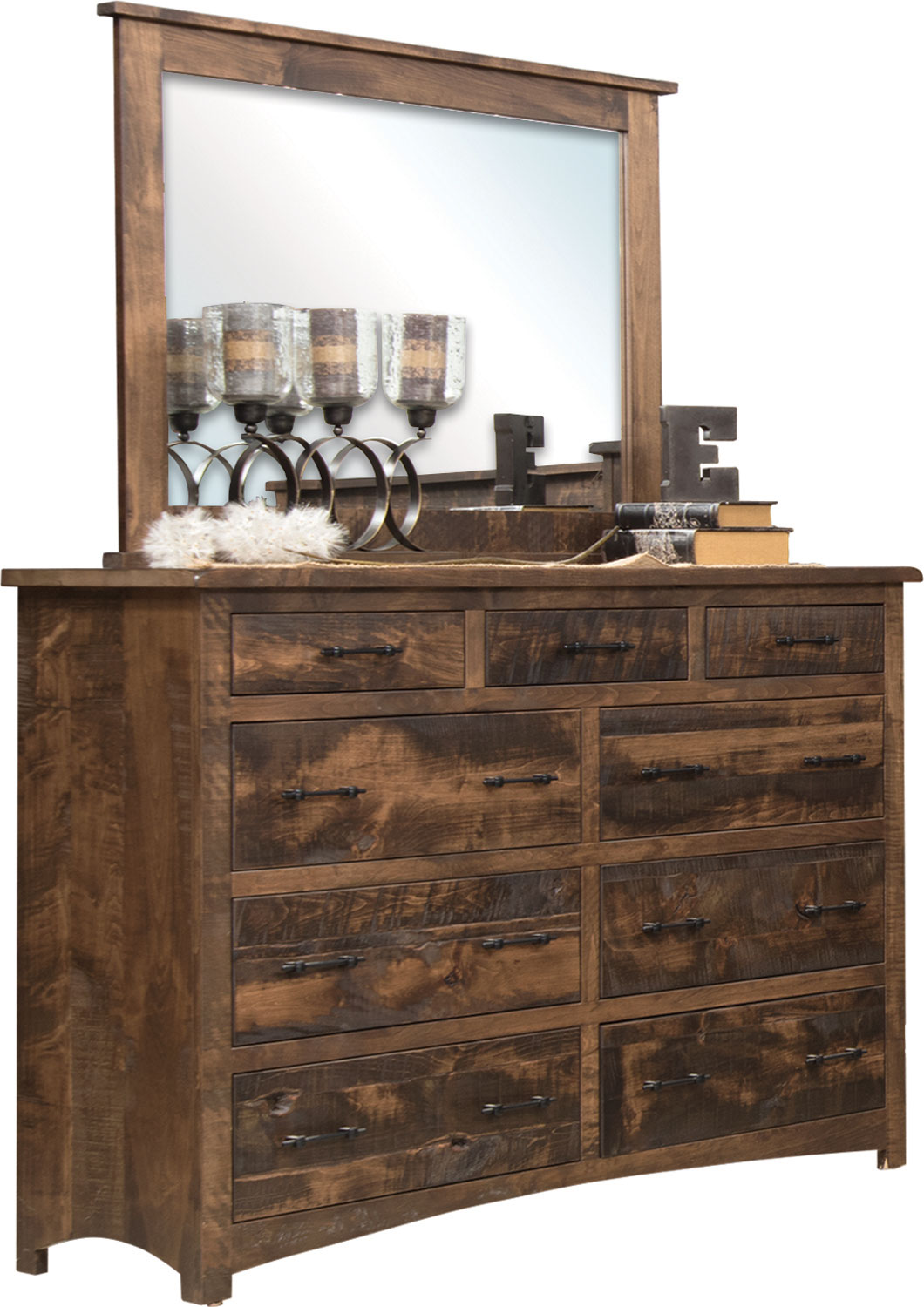 Presenting a Mission-style, solid hardwood bedroom group with a rustic flair. Meet the Barn Floor Bedroom Set. Check out the clean lines, flush drawer fronts and the black Mission hardware. The set includes a bed, 9-drawer dresser with mirror, a 6-drawer chest and a 3-drawer nightstand. The drawers open the whole way out for easy access to all the items inside. Our Amish cabinetmakers build the set from heavily distressed wood for the rustic effect. No wonder the piece is so eye-catching, sturdy and heirloom-quality! Now, make it yours. Simply fill out the customization fields below. Also, make sure you tell us your choices for wood species, finish and more. Or call 855-768-3270.