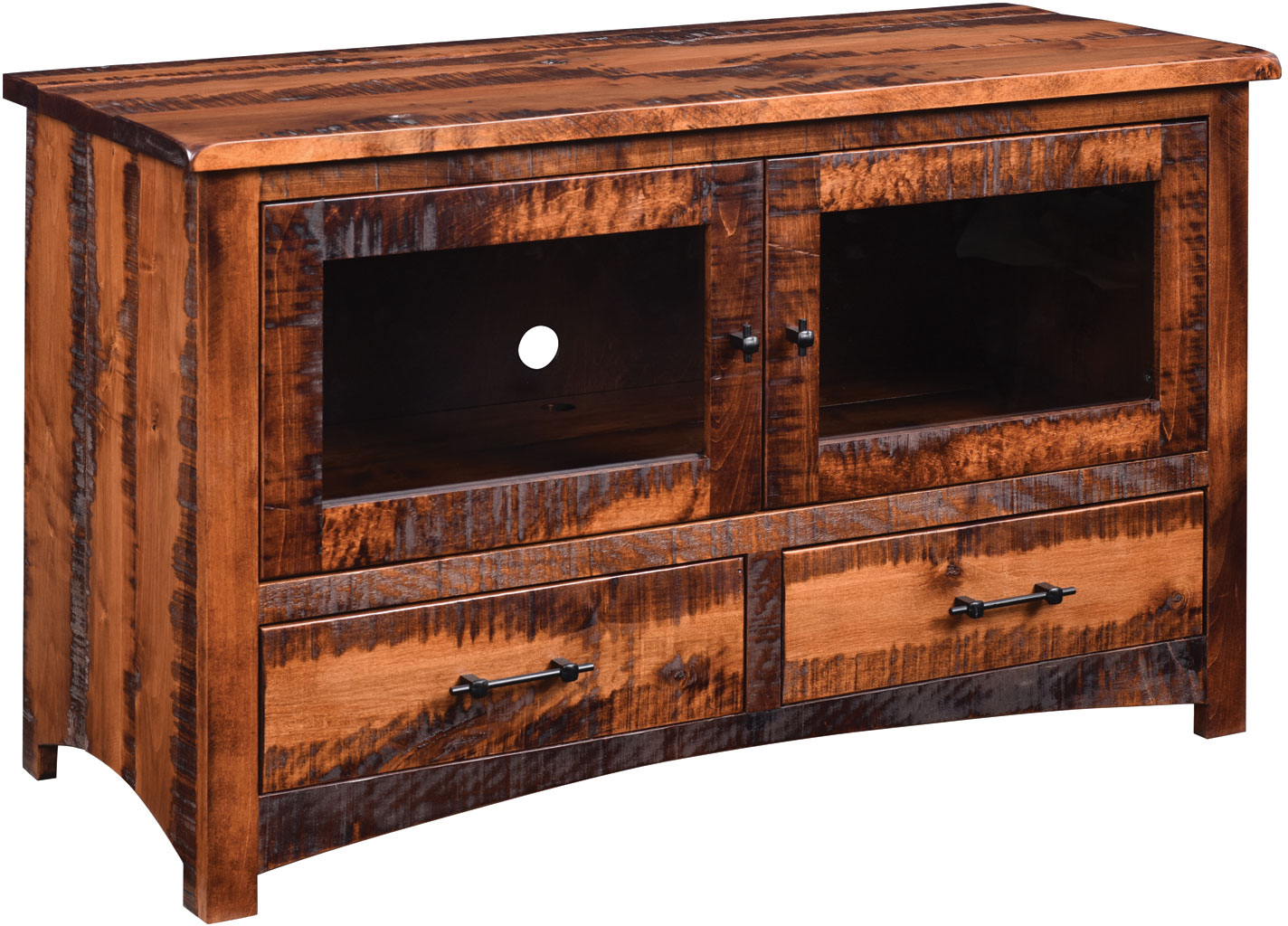 Here’s a midsize TV cabinet that beats ordinary TV stands in style, storage space and durability. Welcome to the Barn Floor Small TV Stand. Open the two glass doors, and you’ll find lots of space for your entertainment equipment. While the two drawers provide ample room for your music and movie collections. Our Amish cabinetmakers build the TV cabinet from rustic brown maple hardwood. Check out the visible saw marks! And the builders finish the unit with Michael’s Cherry Stain. No wonder the TV stand is so sturdy, it’s heirloom-quality! Now, make it yours. Simply fill out the customization fields below. Also, make sure you tell us your choices for wood species, finish and more. Or call/text 855-768-3270.