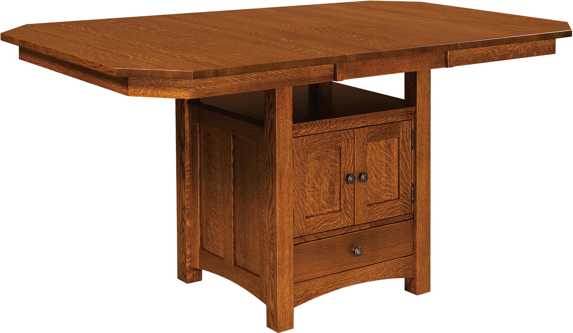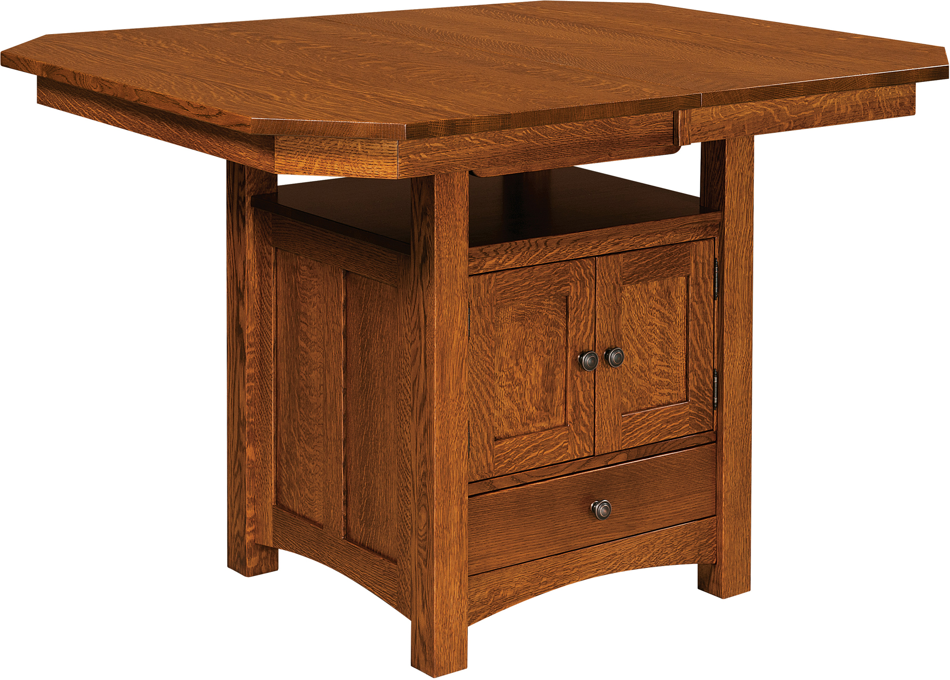 The Bassett Cabinet Table has unique storage features in its beautifully crafted base. The cabinet base is 26 inches wide by 24 inches deep and comes standard with two doors on all sizes. However, the drawer is only standard on the 30 inch and 40 inch high tables. If your kitchen is lacking cabinet space this Bassett Cabinet Table is one way to assist in solving that problem. Store your table linens, serving bowls or even your child’s arts and crafts supplies out of sight. The solid wood tabletop is 1 inch thick with 6-inch clip corners and a mission edge. It is sure to become the favorite place for your family and friends to gather for dinner, play games and socialize.