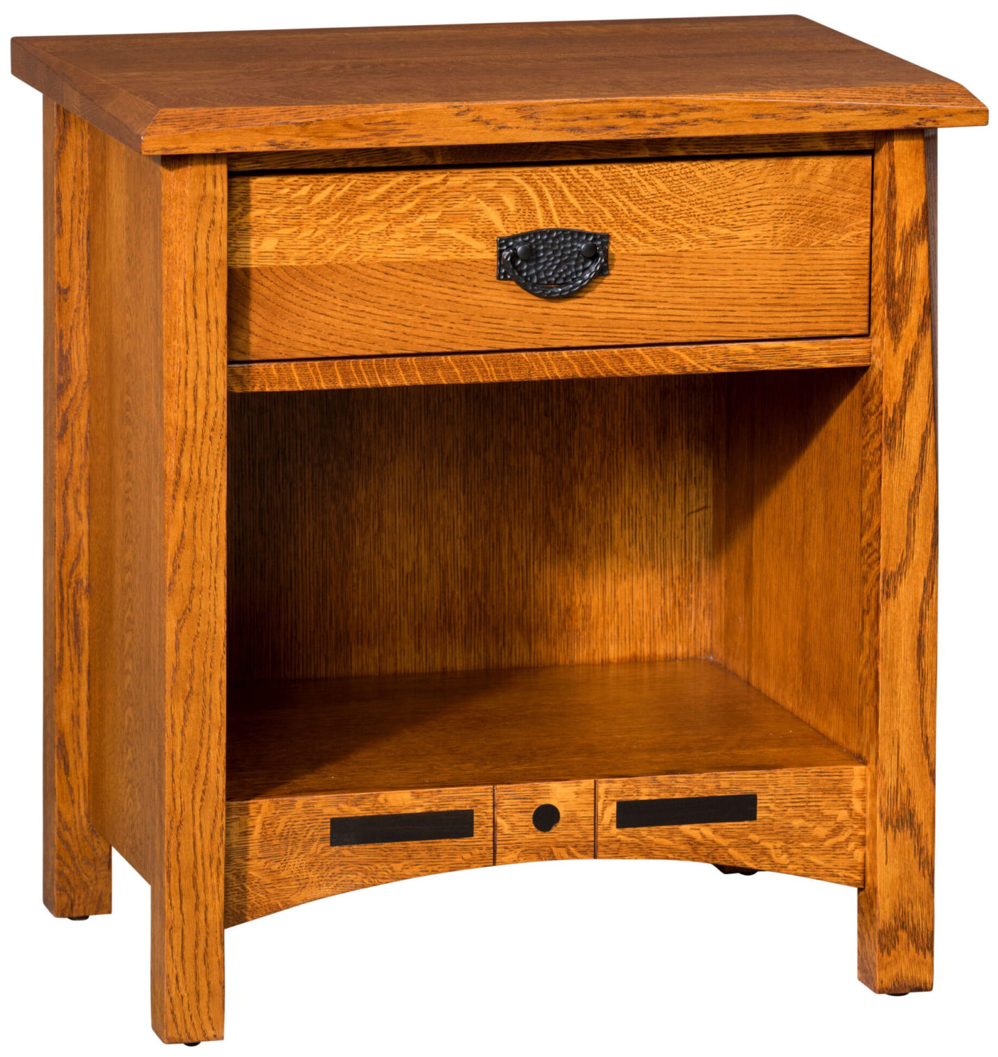 Eye-catching features combine with a great design and solid hardwood Amish construction. The Bel Aire Open Nightstand is quite the find for your stylish bedroom! Notice the hammered drawer hardware and ebony inlays. The drawer opens full-extension. So, you’ll enjoy easy access to what’s inside. Even items at the back. Our Amish cabinetmakers craft the unit. And they use top hardwoods. Like cherry and quarter-sawn white oak (shown with Michael’s Cherry stain). No wonder the nightstand is so sturdy, durable and heirloom-quality. Now, make it yours. Simply fill out the fields below. Also, make sure you tell us your choices for wood specie, finish and more. Or call 855-768-3270.
