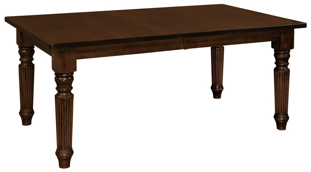 This Berkshire Dining Table is a traditional dining table with beautifully carved legs. You see it here is brown maple with coffee stain. It is sure to add beauty and style to your most used room, the dining room. Friends and family will gather, converse and bond with one another around this table for years to come. Therefore, it is so important to find one that meets all of your needs. Its 1 ¼” rectangular top is smooth with a mission edge and 3 ½” straight skirt. Its table legs are 4 ½” with a clean finish. However, feel free to choose the reeded leg you see in the room photograph. Don’t forget to complete the look with the Berkshire reeded chair. Peruse our other custom options such as wood species, stain, table thickness and up to four table leaves to make this Berkshire Table unique to your dining room.