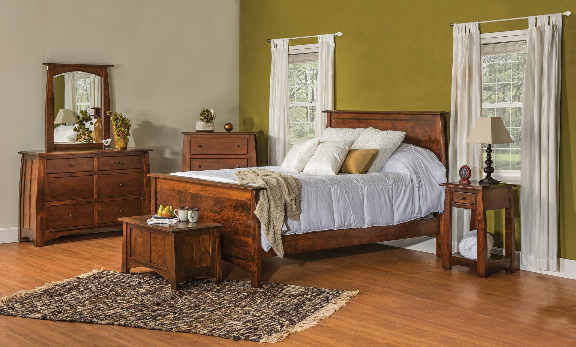 A curved profile, ebony inlays, and an arch base. The Boulder Creek Cherry Bed is, indeed, a great-looking piece. Imagine this lovely bed as the center of attention in your bedroom! We offer the bed in king, California king, queen (shown), full, and twin sizes. So, you can choose the size that’s best for you. Our Amish cabinetmakers build the bed. They use top hardwoods like oak, maple, and rustic cherry (shown with Burnt Umber stain). No wonder the bed is so sturdy and heirloom-quality! Now, make it yours. Simply complete the customizing fields below. Also, make sure you include your choices for wood species, finish, and more. Or call 855-768-3270.