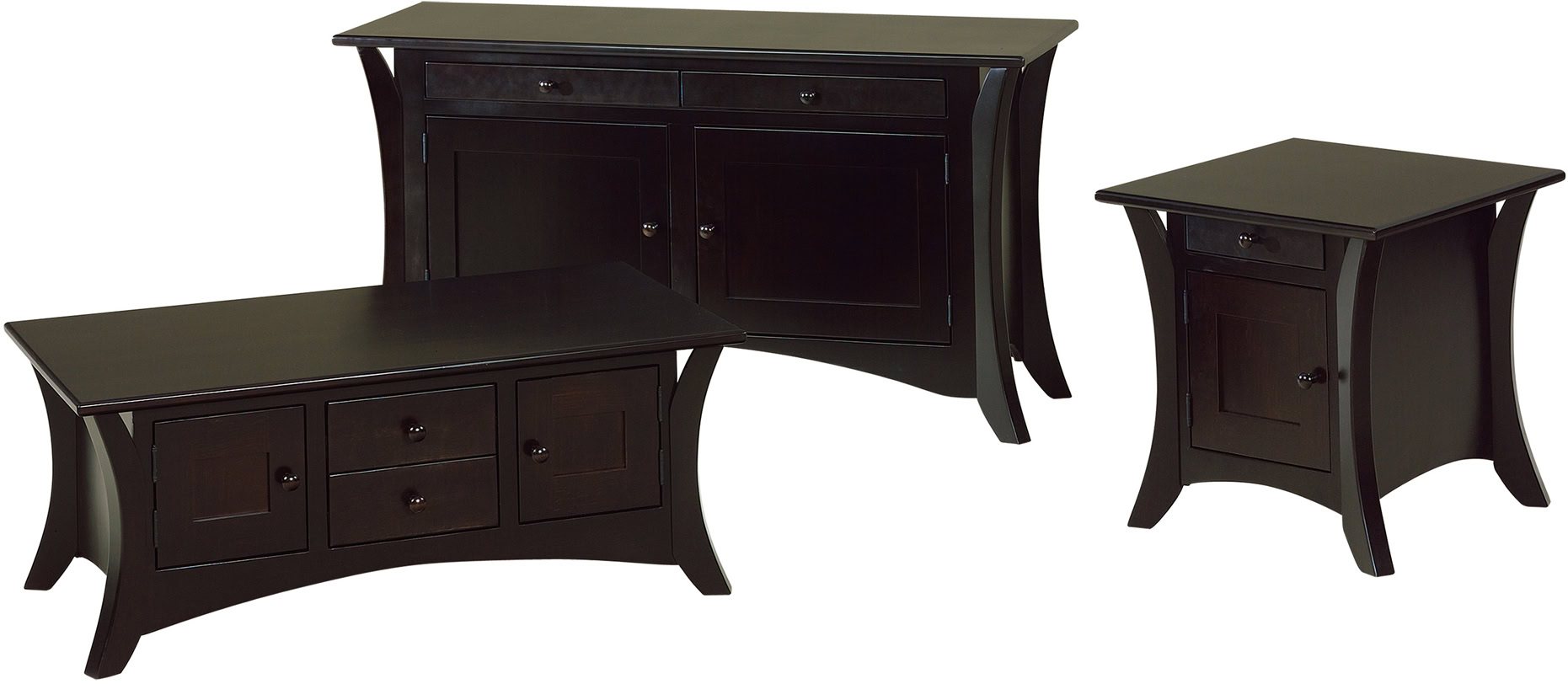 With its beautiful curved lines and chic style, the Caledonia Occasional Table Collection represents the best in contemporary living room furniture. Notice the recessed door panels and the Shaker wood knobs.