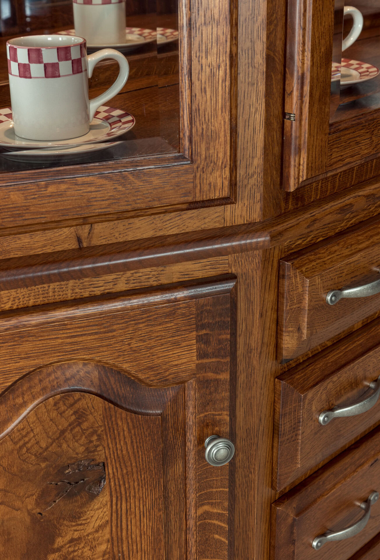 Presenting a hutch that represents the epitome of looks, style, features and grandeur. Meet the Cantilever Hutch. From the ornate crown molding to the carved legs, from the beveled glass doors to the mirror back, this hutch turns heads! You’ll be proud to display your glassware, dishware and figurines on the adjustable glass shelves, each with a plate groove. While the LED lights enhance the glow of the piece. What’s more the drawers open full-extension for easy access. Our Amish cabinetmakers build the hutch with hardwoods like oak, maple and cherry. No wonder the hutch is so sturdy, it’s heirloom-quality! Now, make it yours. Simply fill out the customizing fields below. Also, make sure you include your choices for wood species, finish and more. Or call 855-768-3270.