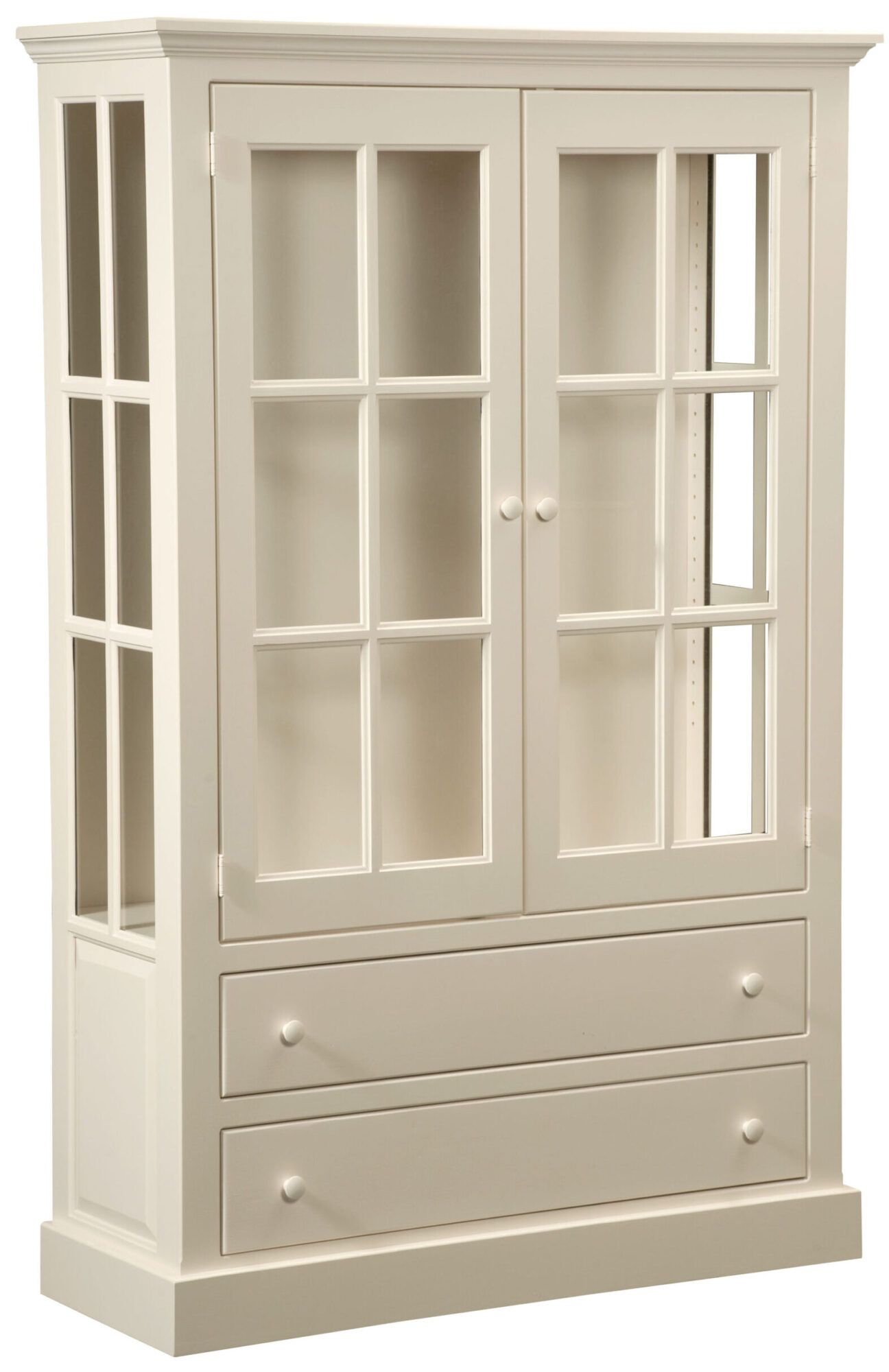 Presenting a Mission-style hutch with great storage and display space for your dinnerware, glassware, figurines and more. It’s the Cape Cod Sideboard. We place two adjustable shelves behind the mullion glass doors. So, you’re all set to show off your precious items. Also, the drawers are perfect for items like silverware, dinner napkins, placemats and the like. Our Amish cabinetmakers build the piece with hardwoods like oak, maple and cherry. No wonder it’s sturdy and heirloom-quality! (We’re showing the unit in Country White paint.) Now, make it yours. Simply fill out the open (blank) fields below. Also, make sure you tell us your choices for wood species, finish and more. Or call 855-768-3270.