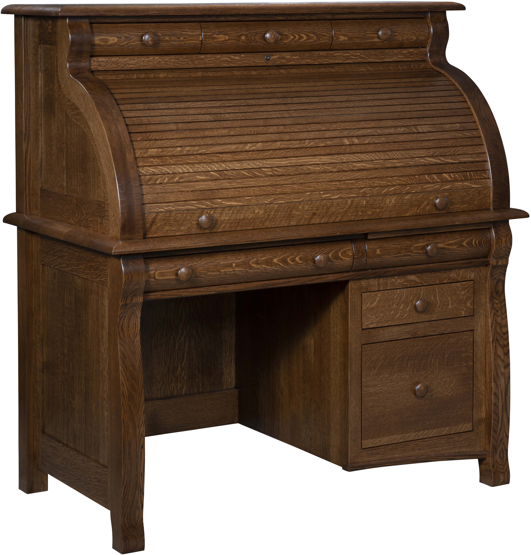 The practicality of an office desk and credenza with the quaintness of a rolltop. Welcome to the Castlebury Small Rolltop Desk. With the tambour (flexible wood panel) rolled up, you get a nice workspace. Plus handy drawers and cubbies for small office items. We also include a pullout writing board for added workspace. While the letter-size drawer comes in handy for your important files. With the tambour rolled down – and locked – your work area is secure. And the rolltop feature gives your office a retro look and feel. Our Amish cabinetmakers build the desk. And they use top hardwoods like quarter-sawn white oak (shown with Lite Asbury finish). No wonder the piece is heirloom-quality! Now, make it yours. Simply complete the customizing fields below. Also, make sure you include your choices for wood specie, finish and more. Or call 855-768-3270.