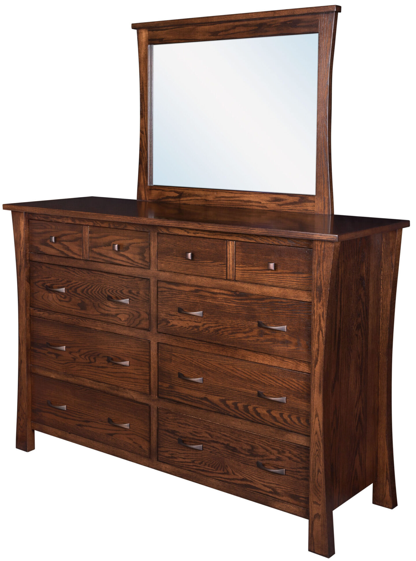 A distinctive curved profile complemented by flat drawer fronts and stylish metal hardware. These features make the Catalina Dresser with Mirror stand out from the rest. Placing it at the top of your wish list. Cool features abound. Like an available beveled mirror. Also, the drawers open full-extension for easy access to everything inside. While the dovetail drawer joints excel in strength. The eight large drawers provide lots of storage space. (The top two drawer fronts are designed to look like four drawers.) Our Amish cabinetmakers handcraft the dresser. Also, they use top hardwoods. Like cherry, maple and oak. No wonder the dresser is so sturdy. Durable. Plus heirloom-quality! Now, make it yours. Simply complete the customizing fields below. Also, make sure you include your choices for wood specie, finish and more. Or call 855-768-3270.