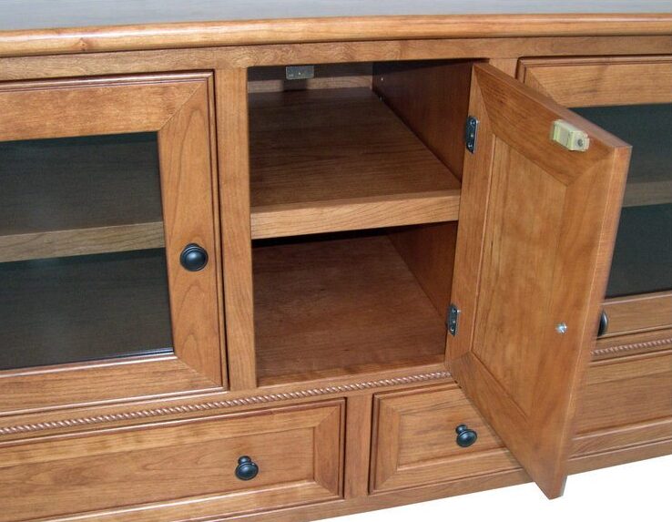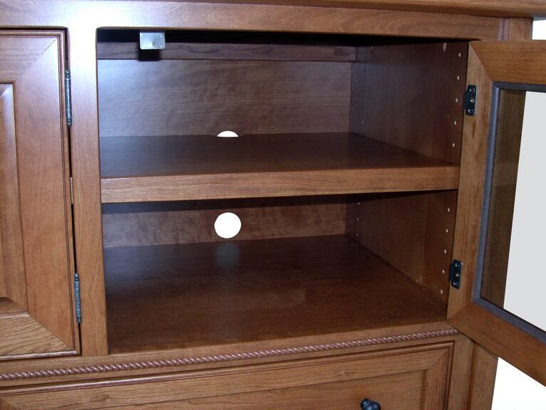 Our Amish cabinetmakers include a host of performance-enriching features. Like the lightly smoked glass doors. They partially obscure your devices. Without hindering your remotes from operating. Also, you’ll find an adjustable shelf behind each door. So you can make the best use of the space.