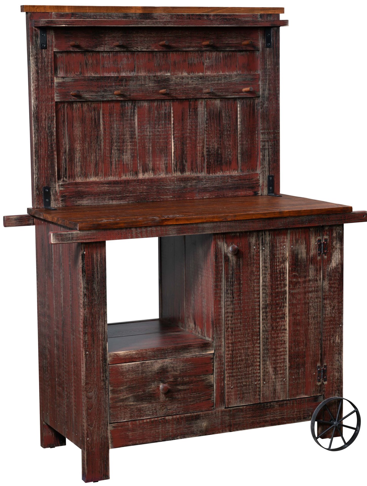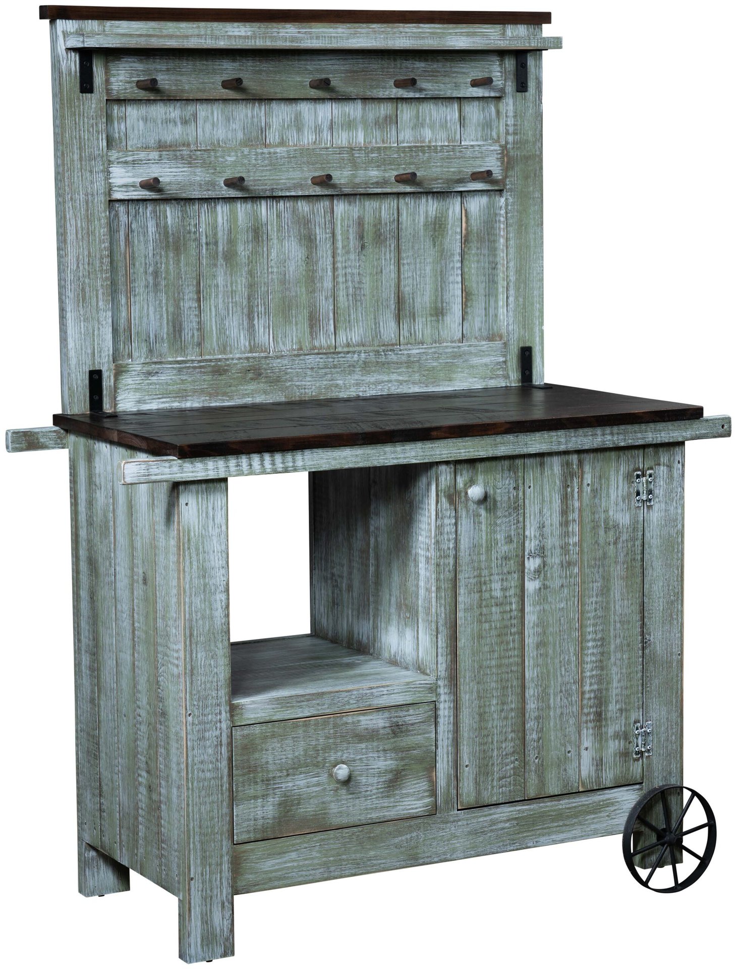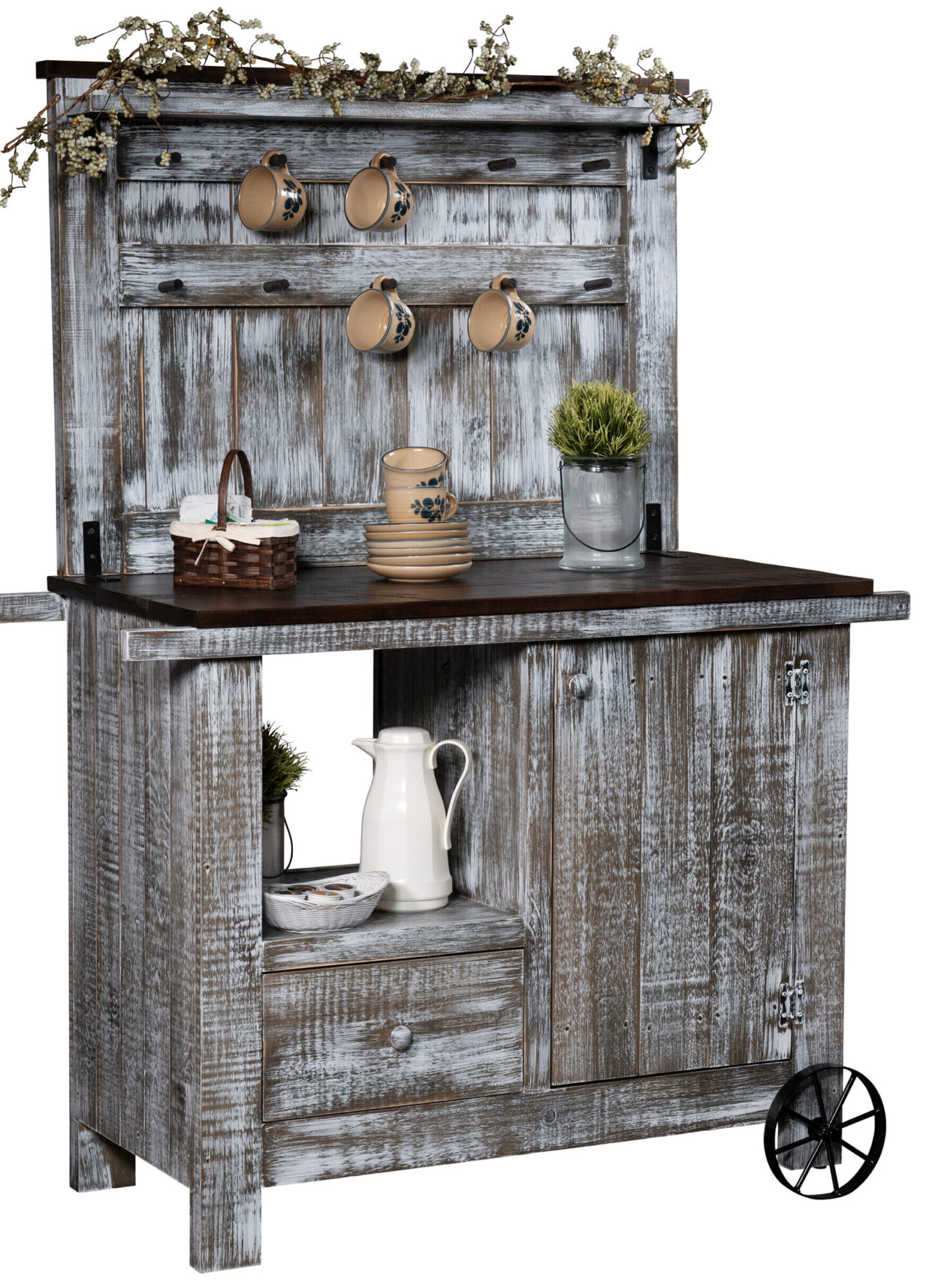 As the ideal coffee-serving station, the Coffee Wagon is a great choice for the coffee, tea or other good-times gathering spot in your home. You can even push the wagon around! The tabletop and backsplash provide lots of space for serving and for hanging coffee and tea mugs. And below the tabletop, we create open and enclosed spaces for your coffee and tea accouterments. Our Amish cabinetmakers build the piece from all new pine wood. So, the unit is heirloom-quality! Now, make it yours. Simply fill out the customization fields below. Also, make sure you tell us your choices for wood species, finish and more. Or call 855-768-3270.