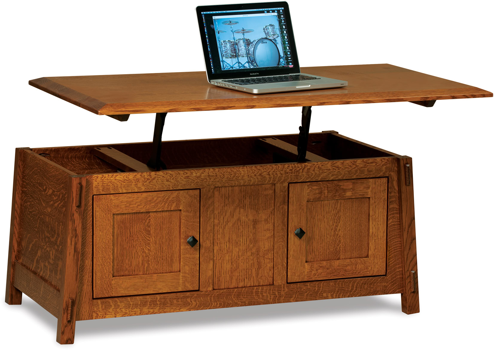 We offer this lovely coffee table with great standard features. For example, the doors have concealed hinges and a soft-close feature, so your kids cannot slam them, even if they want to. One inch black square knobs accentuate the Mission style, but we can switch these out for your preferred hardware. Plus, we offer a lift-top option for this coffee table! So, you can happily lounge with your feet up or raise the top to work on your computer from the comfort of your living room!