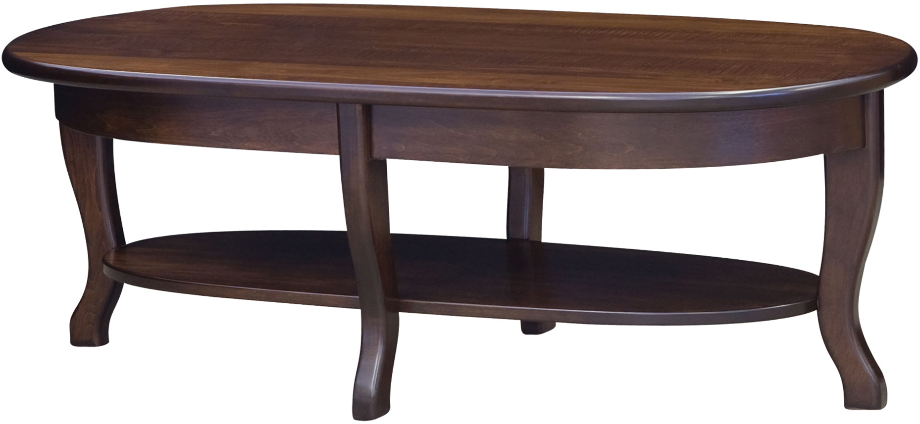 From the oval-shaped top to the bottom shelf to the curved and splayed legs, the Crestline Amish Coffee Table represents the ultimate in formal beauty and Amish custom cabinetmaking. You couldn’t ask for a more prestigious-looking centerpiece in your living room! Our Amish craftsmen handcraft the Crestline Amish Coffee Table. Also, they use regional hardwoods. Such as brown maple (shown with OCS-228 Rich Tobacco Stain). In addition, our builders draw from woodworking skills handed down from their ancestors. No wonder the coffee table is so sturdy. Beautiful. And heirloom-quality! Now, make it yours. Simply complete the customizing fields below. Also, make sure you include your choices for wood species, finish, and more. Or call 855-768-3270.