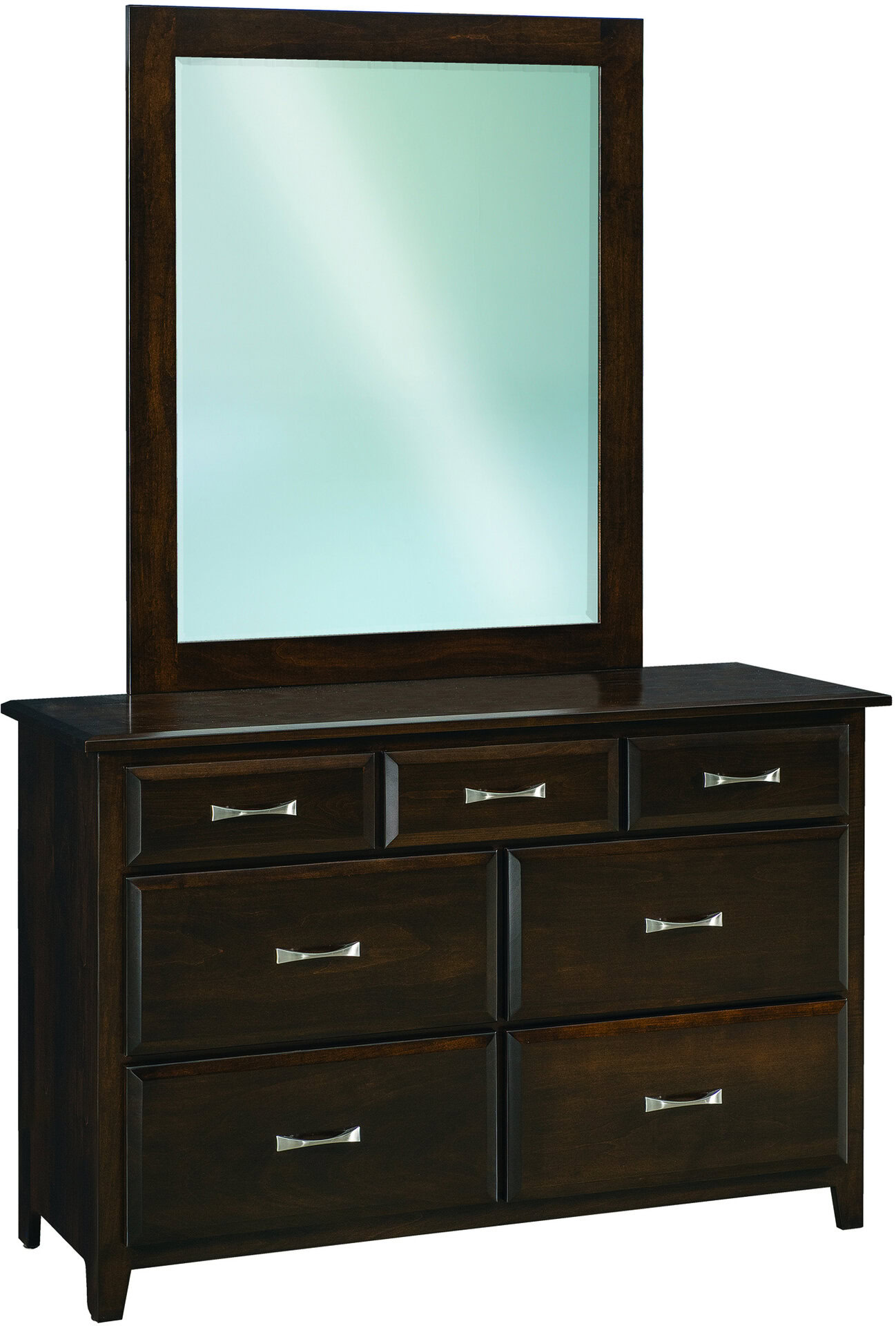 Elegant, large and Mission-style. This is why the Eckenridge Seven-Drawer Dresser is perfect for your upscale bedroom. Because its simple, straight lines catch the eye. So does the bold, wholesome persona. Also, the drawers open full-extension. The result? Easy access to everything inside. While the dovetail joints enhance strength. We offer the dresser with or without a mirror. (Dresser and mirror are available in two widths.) Amish artisans build each Eckenridge Seven-Drawer Dresser. Also, they use top hardwoods. So it’s heirloom-quality! Now, make it yours. Simply complete the customizing fields below. With your choices for wood specie, finish and more. Or call 855-768-3270.