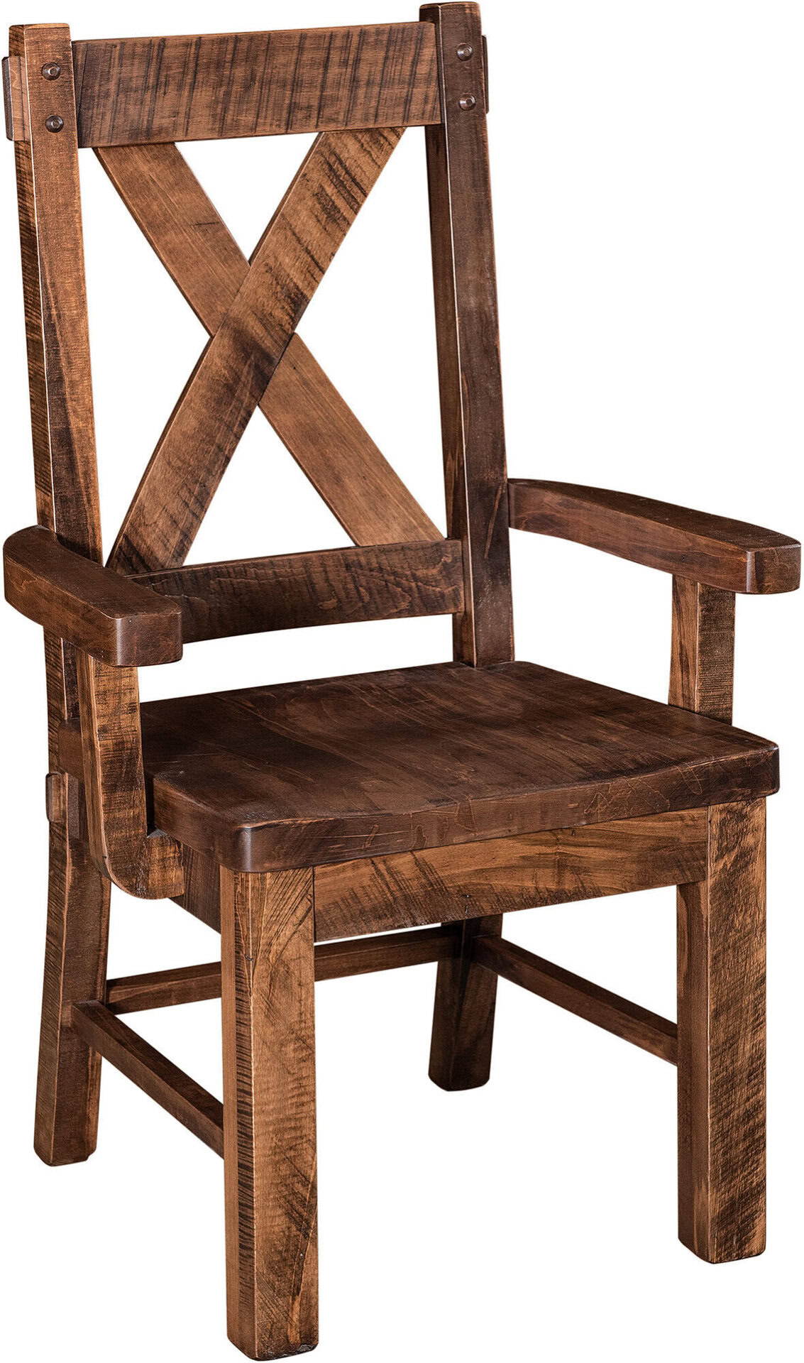 A dining table and bench hewn from 1 ¾-inch-thick rough-sawn wormy maple with a live edge and sitting on a black powder-coated metal base. Welcome to the El Dorado Trestle Dining Set. It’s the icon of rustic with a modern vibe! In fact, the ‘natural’ live edge means each piece is unique. And that’s worth bragging about! Then, check out the crisscross backrest and exposed tenons on the chairs. Also the thru-tenon detail on the bench. They’re so eye-catching! Our Amish artisans handcraft each El Dorado Trestle Dining Set. No wonder it’s so sturdy. Rustic. Also heirloom-quality! Now, make it yours. Simply complete the customizing fields below. Also, make sure you include your choices for wood specie, finish and more. Or call 855-768-3270.