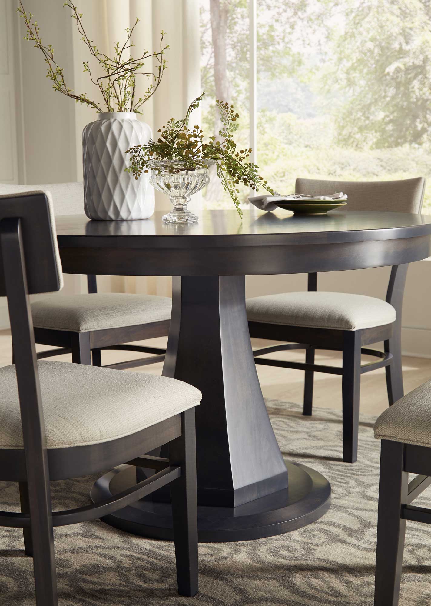 The Emerson Dining Set is perfect for any upscale dining room. Check out the dining table. Its large base gracefully tapers upward. So the table creates a beautiful centerpiece. Also, you can choose different size tables – plus added leaves. All to meet your needs and desires. The Emerson chair features a simple Mission-style design. Along with a liberally padded seat and backrest. Plus it comes as a side chair or arm chair. Amish cabinetmakers build each Emerson Dining Set. In addition, they use top hardwoods. So the collection is incredibly sturdy. Durable. Also heirloom-quality! To order, click the “Customize this product” button below. Then, complete the “Customize Product” fields. Also click the “Get your customized quote” button. Or call 855-768-3270.
