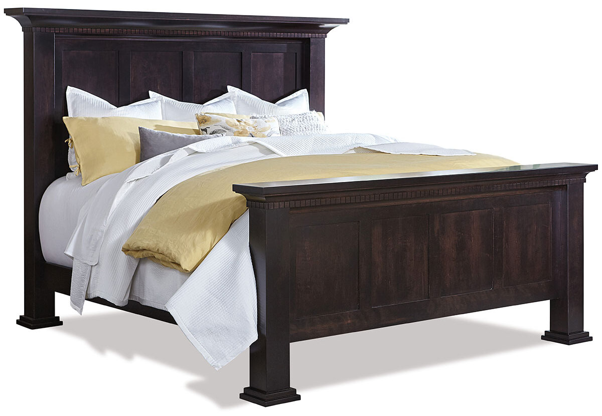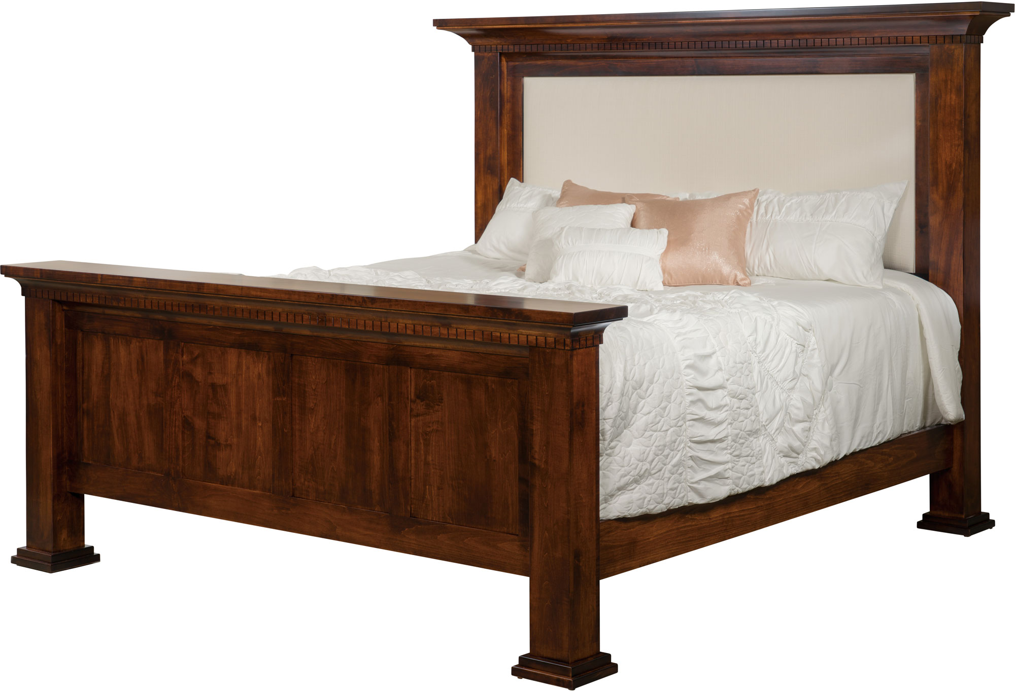Ornate crown molding with dentil trim catch your eye on the Empire Bed. Then you spot the reverse panels and hefty feet. And you’re struck by the rich, fine-furniture look of the piece. You may request an upholstered fabric inlay for even more comfort and elegance. We offer the bed in several sizes, including full, queen, California king and king (shown). Your choice. Our Amish cabinetmakers handcraft the bed. And they use top hardwoods like oak, cherry and brown maple (shown with Onyx stain). No wonder the bed is so sturdy and heirloom-quality! Now, make it yours. Simply complete the customizing fields below. Also, make sure you include your choices for wood species, finish and more. Or call 855-768-3270.