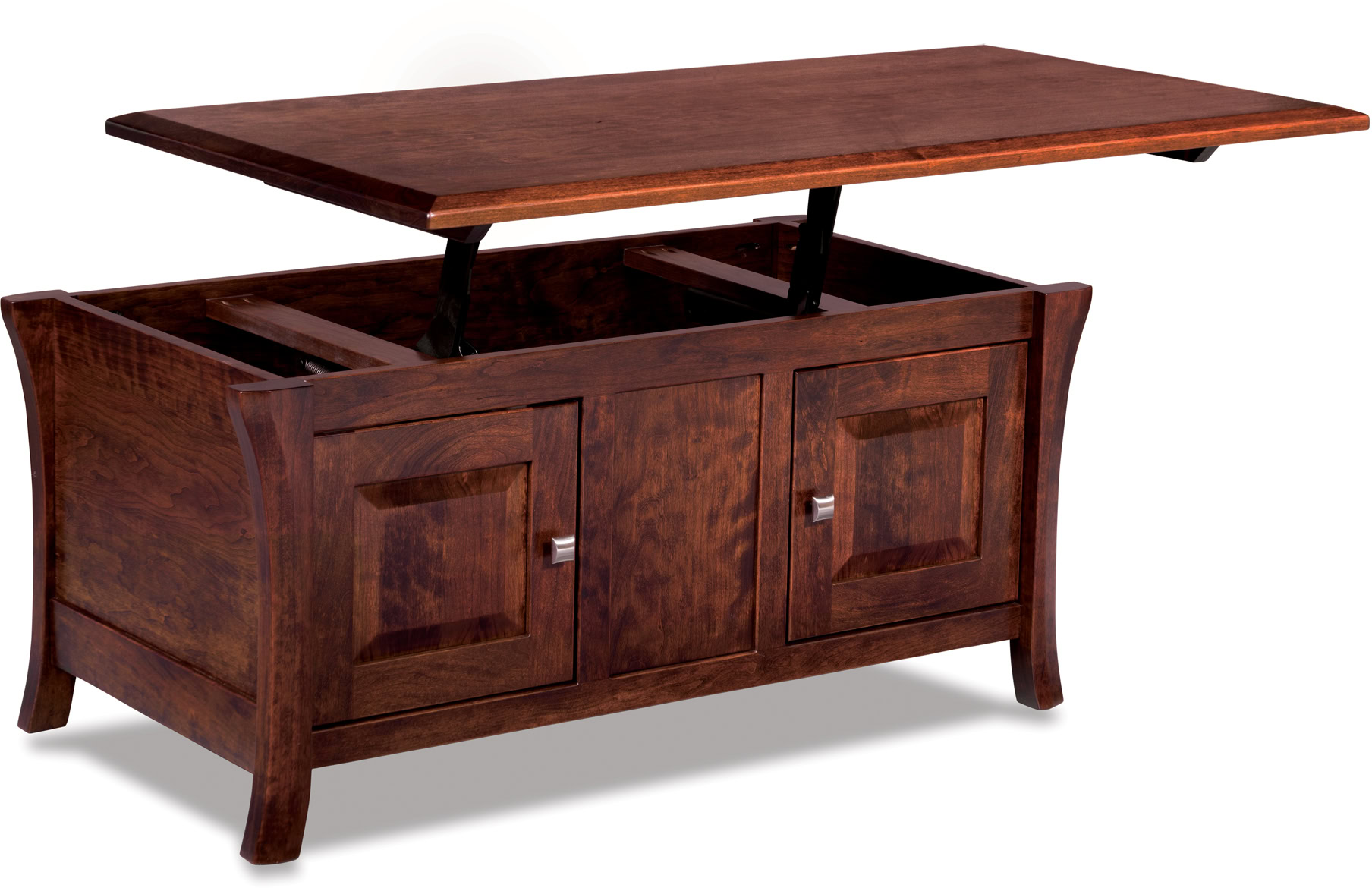 We offer the Ensenada Enclosed Coffee Table with standard features that you usually find as upgrades elsewhere. We mount the doors on concealed hinges and they have a soft-close feature. So, your kids won’t be able to slam the doors, even if they want to. Satin nickel door knobs highlight the table’s elegance, as well. However, if that isn’t enough, you can opt to create a lift-top coffee table. The top raises to 29 1/4 inches high, so the coffee table becomes the perfect spot to enjoy a meal or work at your laptop — all from the comfort of your couch.