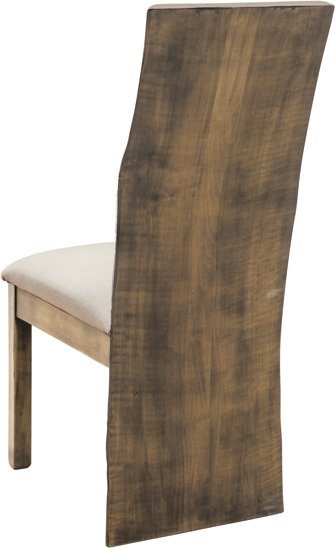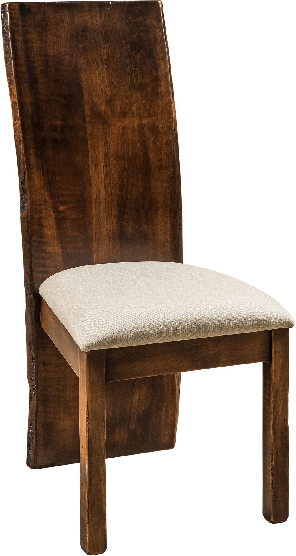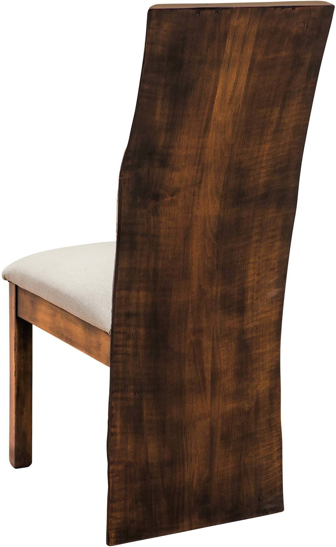 The Evergreen Chair looks like a piece of artwork added to your dining space. The modern planed wood back is paired with a comfortable padded seat. It is shown in Wormy Maple with Worn Spice-10 Sheen, along with 16-101 Rhinestone fabric. These can all be customized with your selection of hardwood, stain color, and fabric choice. The Evergreen Chair is only available as a side chair due to its modern style. So you could pair it with completely different armchairs at either end to add a modern flair to your decor.