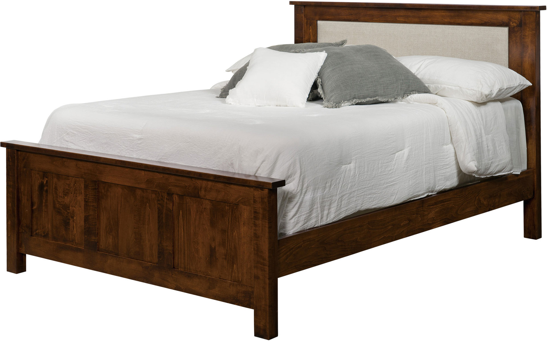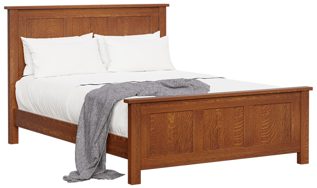 The Flush Mission Bed features the clean lines and stately persona of the Mission style. Along with reverse panels on the headboard and footboard. Want even more style and comfort? Ask for the upholstered fabric headboard. We offer the bed in king, California king, queen (shown), full and twin sizes. So, you can get the size that’s right for you. Our Amish cabinetmakers build the bed. And they use top hardwoods like cherry, maple and oak (shown). No wonder the bed is so sturdy and heirloom-quality! Now, make it yours. Simply complete the customizing fields below. Also, make sure you include your choices for wood species, finish and more. Or call 855-768-3270.