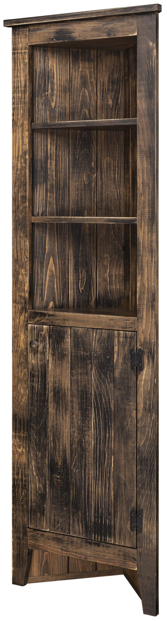 Add a display and storage area to an underused corner of your dining room with the Gold Mine 24-Inch Corner Cabinet. The two shelves give you room to display some of your favorite plates, glassware and/or figurines. Plus, you’ll find more storage behind the doors down below. Rustic features abound. Check out the visible saw marks plus the shiplap doors and back. Our Amish cabinetmakers handcraft the corner cabinet from all new pine wood. (The unit shown has a rustic black finish.) No wonder the piece is so good-looking, sturdy — and heirloom-quality! Now, make it yours. Simply fill out the customization fields below. Also, make sure you tell us your choices for wood species, finish and more. Or call 855-768-3270.