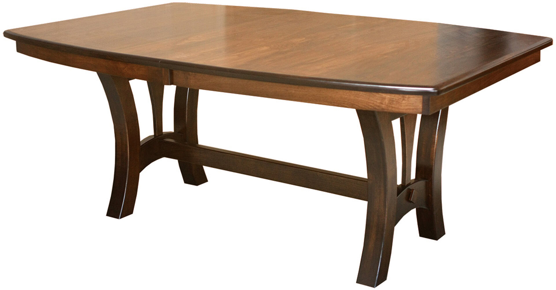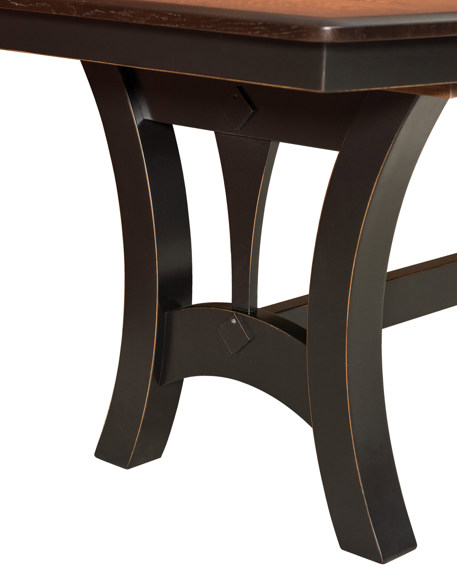 The Grand Island Trestle Table features unique details and offers many shape options to fit your space. Choose from two different widths and three different lengths. It is a self-storing table which makes it so nice. No more trying to keep the extra leaves in a safe, dry location. Be sure to see the options below to determine the table size you want. Then, you will be able to see how many leaves it can self-store with and without skirts. The look on this Grand Island Trestle Table that you see here is two-toned. The top is QSWO wood stained with Michael’s Cherry and has burnished edges. The base of the table is brown maple painted black with Michael’s Rub Thru.