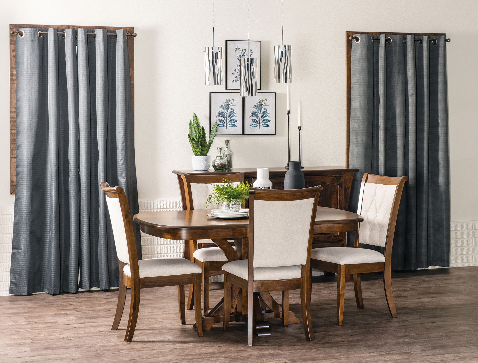 An elegant single pedestal table surrounded by upholstered and tufted chairs. That’s the Granite Single Pedestal Table Set. What a prestigious set for your upscale dining room! Notice the table’s 1-inch, solid hardwood top with elegant bowed ends that match the steam-bent skirt. You may order the table in several sizes. Also, the geared equalizer slides make it easy to extend the table by adding one or more 12-inch leaves. Our Amish cabinetmakers handcraft the set. And they use top hardwoods like oak and hard maple (shown with Manchester stain) plus high-quality foam and fabrics (or leather). No wonder the table and chairs are so sturdy and heirloom-quality! Now, make it yours. Simply complete the customizing fields below. Also, make sure you include your choices for wood species, finish and more. Or call 855-768-3270.