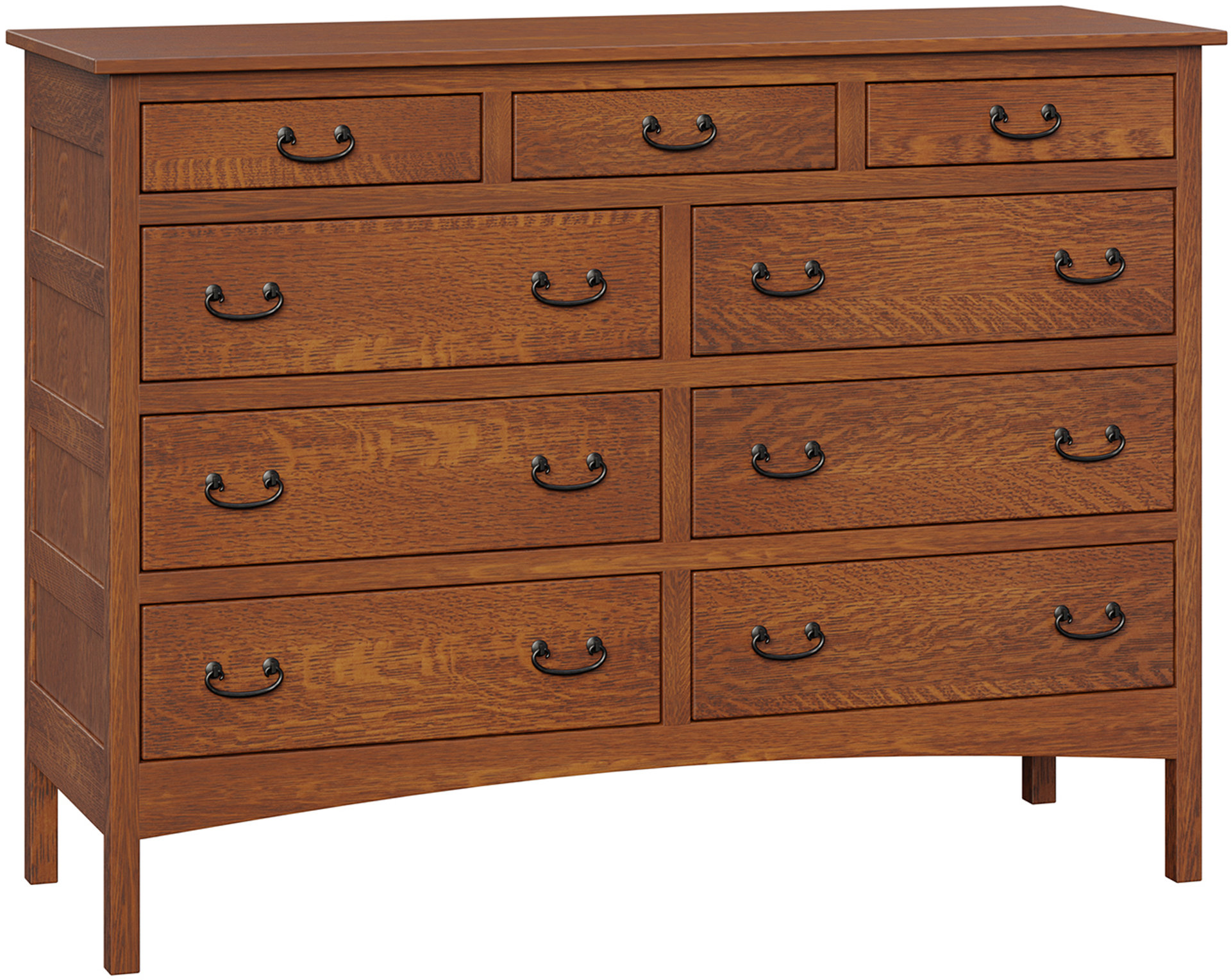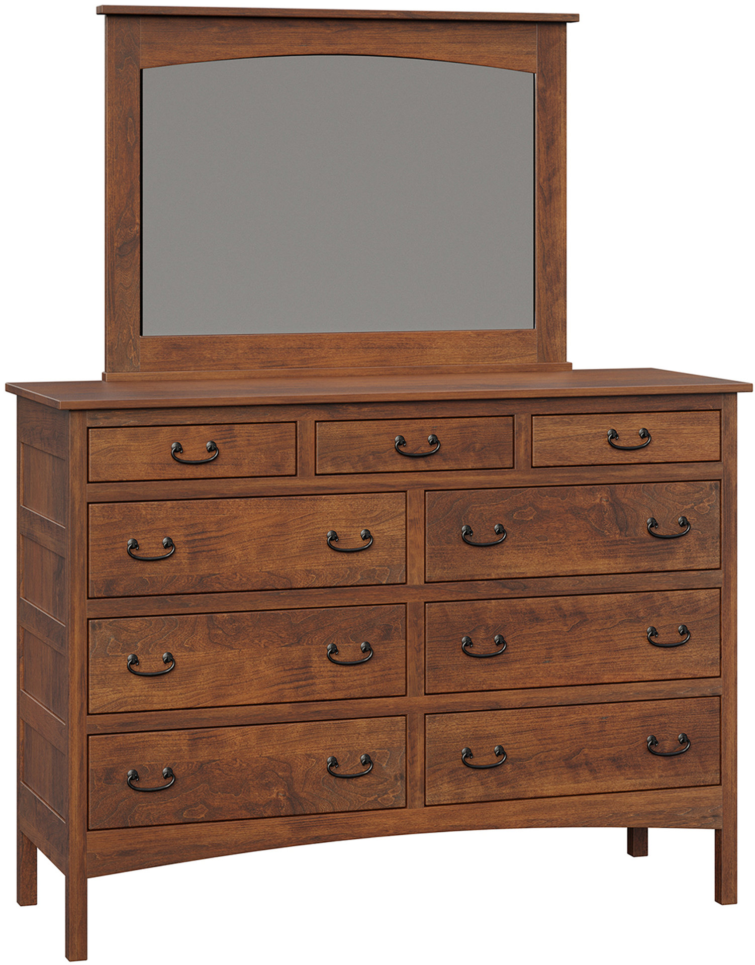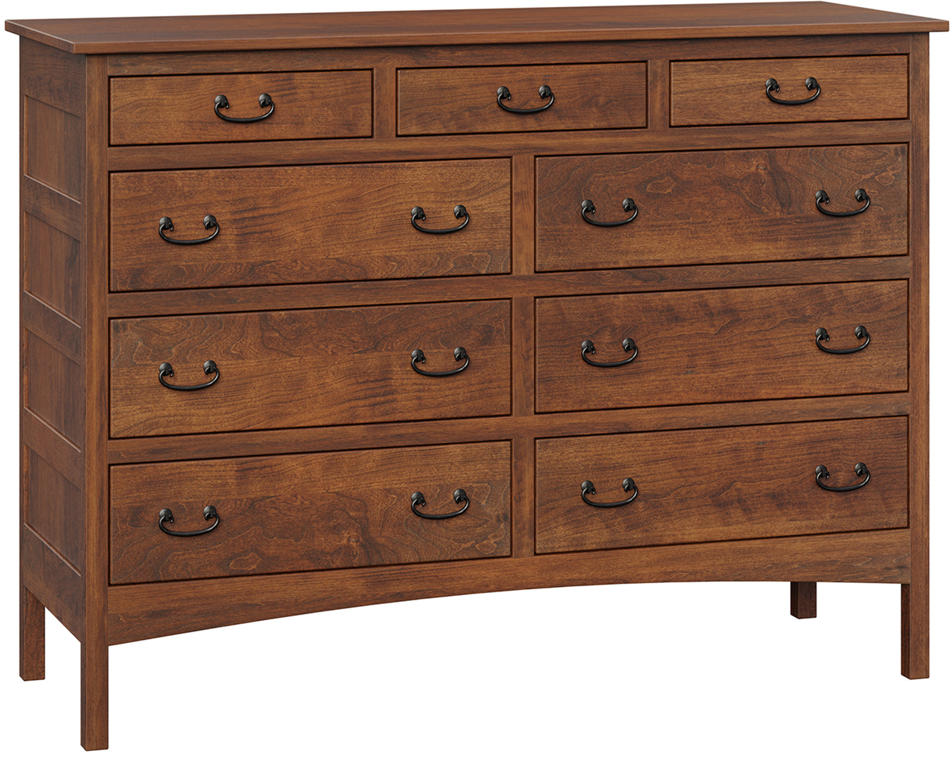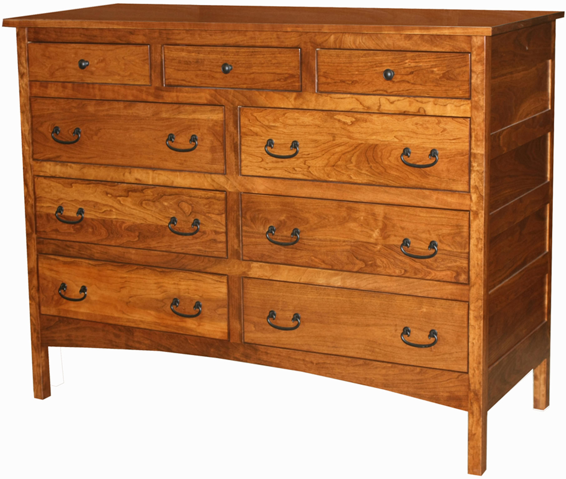 Lots of storage space and an attractive Mission design. That’s the Granny Mission 9-Drawer Mule Dresser. Because it’s Mission, the dresser sports clean lines. And a simple beauty. So it will blend with your existing furniture. Also, the spacious drawers open full-extension. So you’ll enjoy easy access to everything inside. While the dovetail drawer joints enhance strength. Amish artisans build each Granny Mission 9-Drawer Mule Dresser. Also, they use top hardwoods. Like snappy cherry wood (shown). So the dresser is heirloom-quality! Now, make it yours by completing the customizing fields below. With your choices for wood specie, finish and more. Or call 855-768-3270.