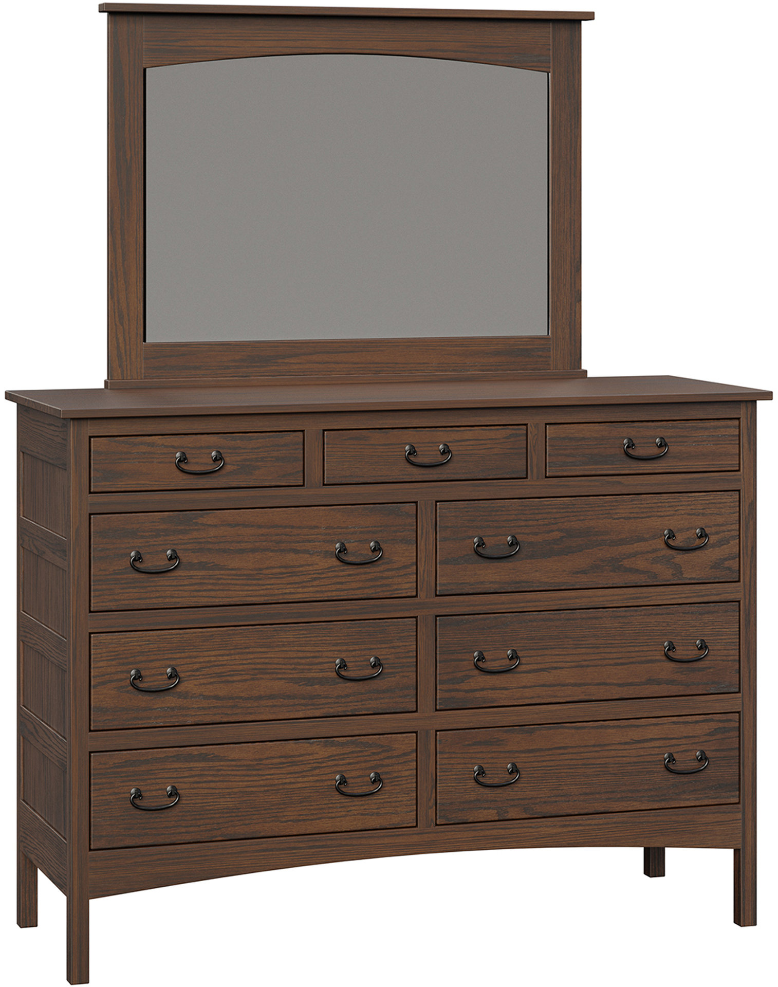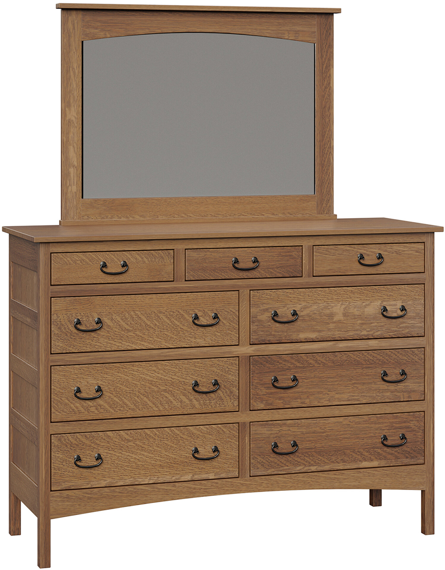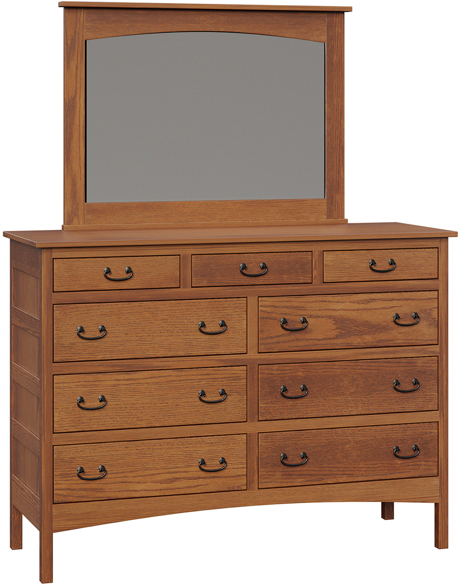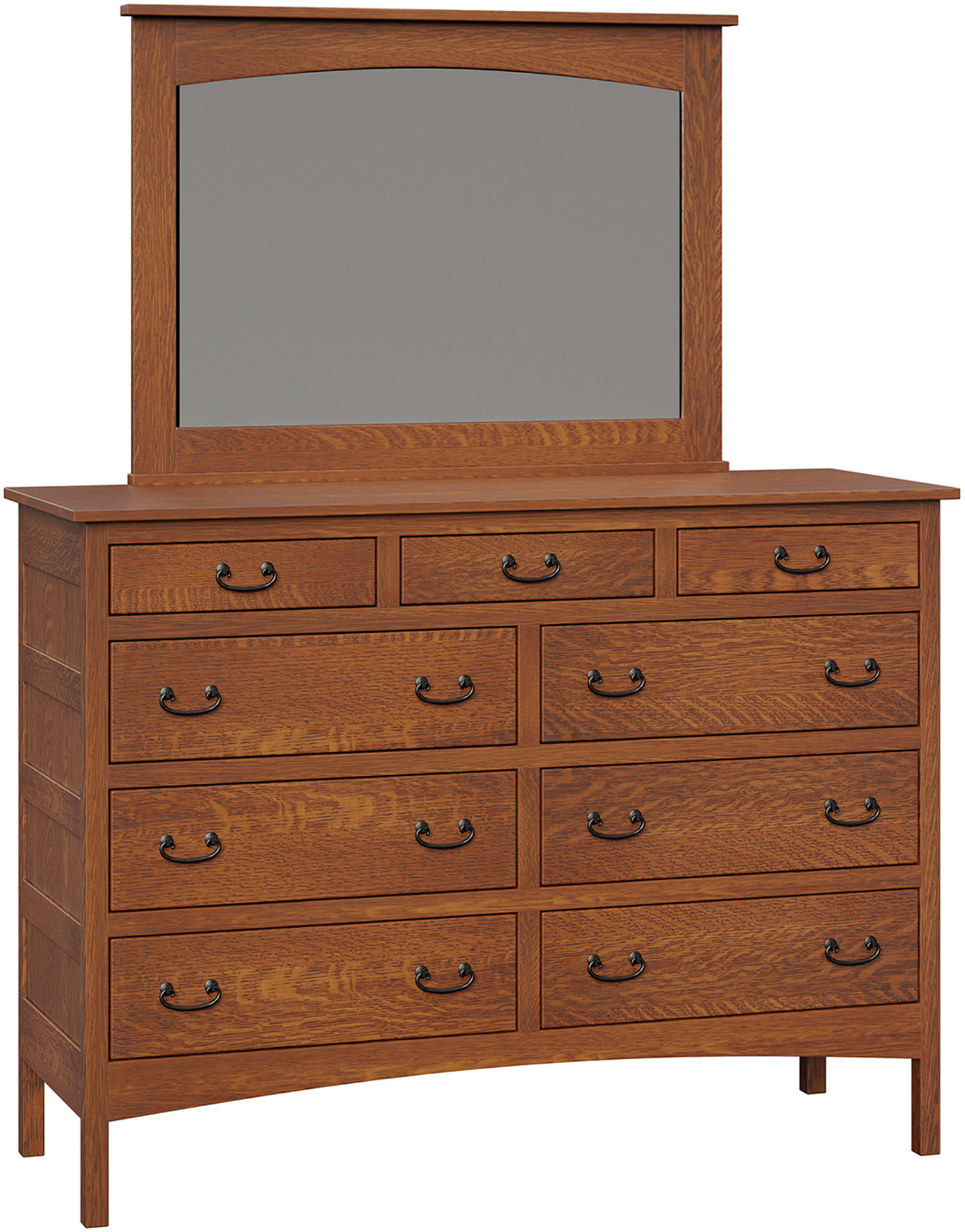 Lots of storage space and an attractive Mission design. That’s the Granny Mission 9-Drawer Mule Dresser. Because it’s Mission, the dresser sports clean lines. And a simple beauty. So it will blend with your existing furniture. Also, the spacious drawers open full-extension. So you’ll enjoy easy access to everything inside. While the dovetail drawer joints enhance strength. Amish artisans build each Granny Mission 9-Drawer Mule Dresser. Also, they use top hardwoods. Like snappy cherry wood (shown). So the dresser is heirloom-quality! Now, make it yours by completing the customizing fields below. With your choices for wood specie, finish and more. Or call 855-768-3270.