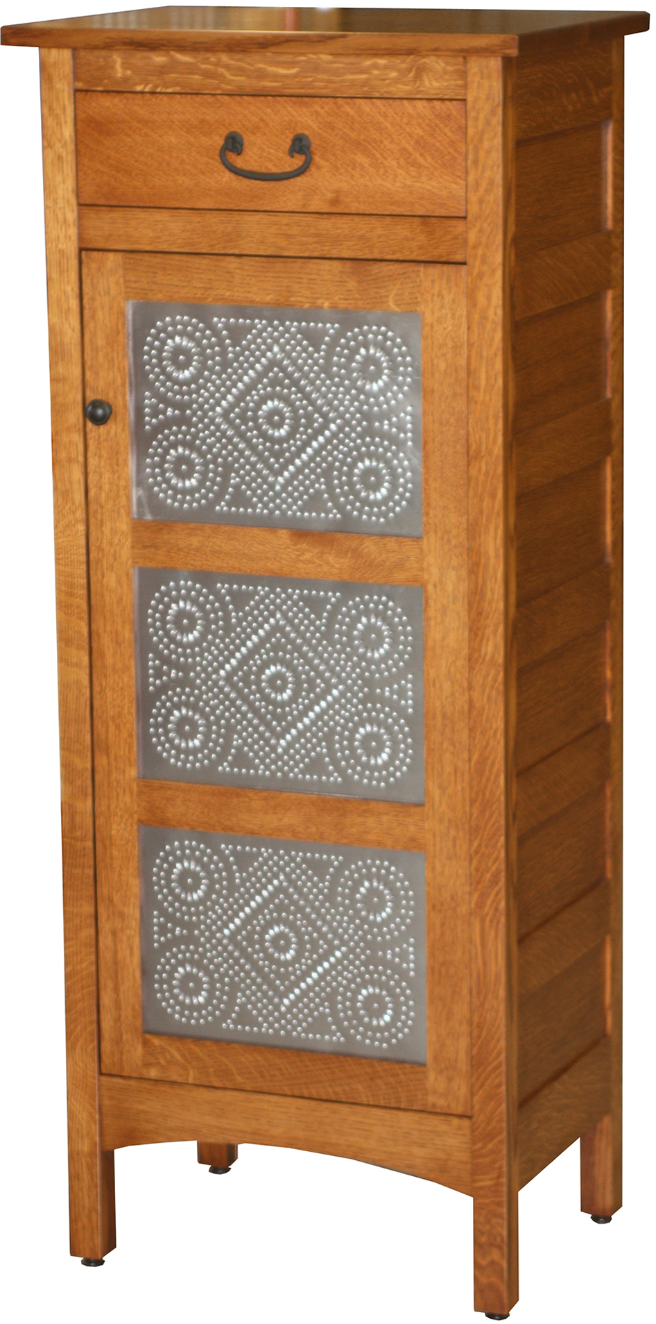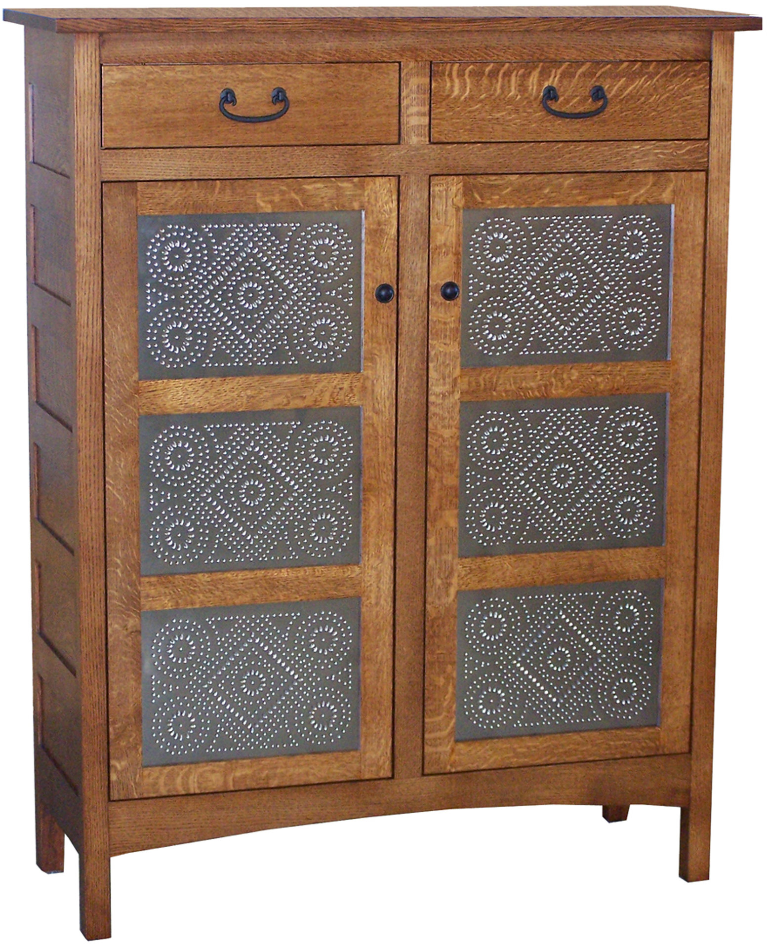 The Granny Mission Pie Safe features beautiful tin door accents and paneled sides and is sure to bring a bit of nostalgia to your living space. It is shown here in quarter-sawn white oak with Michael’s cherry finish and antique tin color. Although it comes standard with tin doors, reversed panel doors are also available for the same price if that is more your style. The Granny Mission Pie Safe also comes standard with two adjustable solid wood shelves making it easy to adjust as your storage needs continue to change. It is shown here with long legs to keep any food items away from the floor as it was traditionally used to store food. If you would prefer you may also customize this pie safe with an enclosed base or with just one door and drawer.