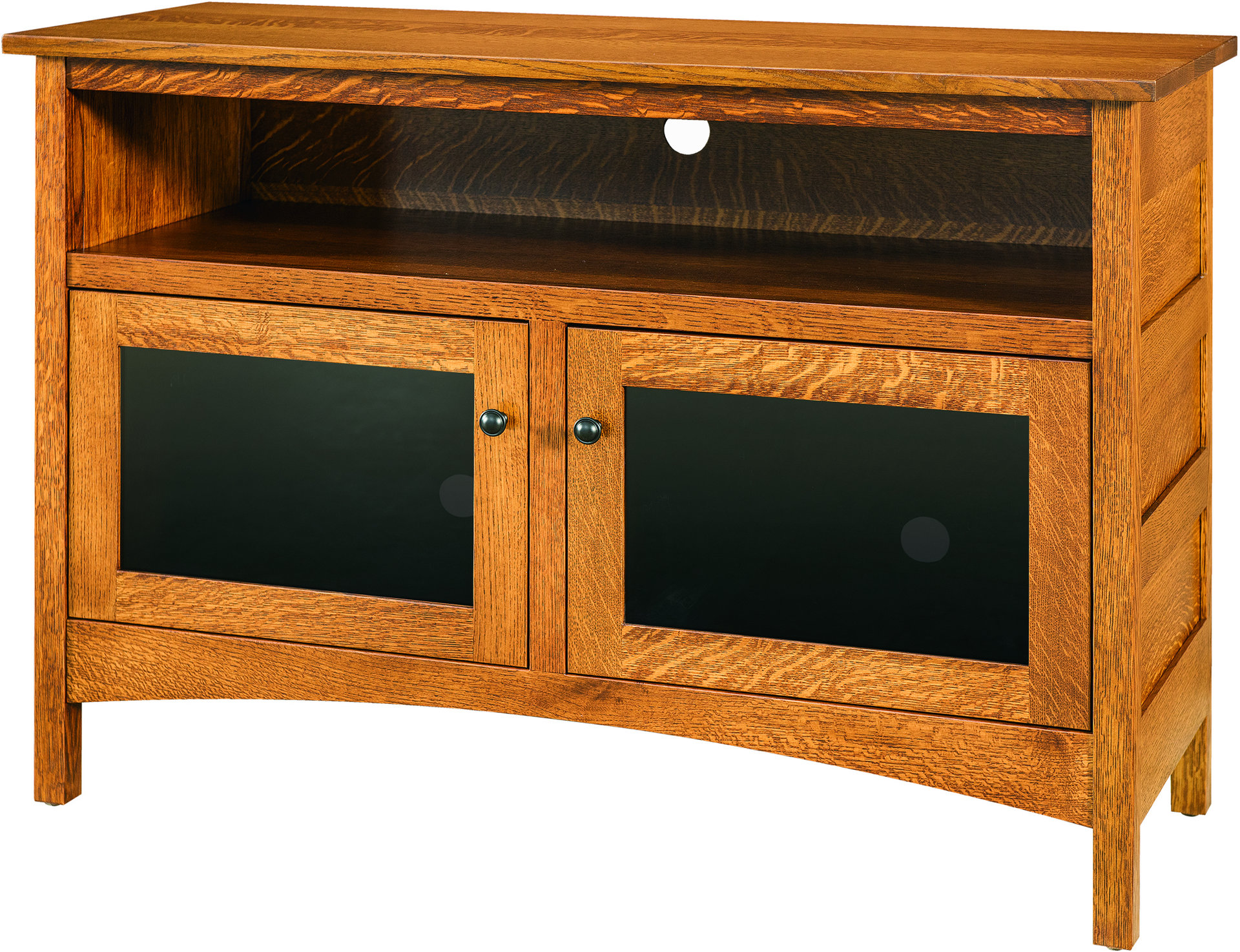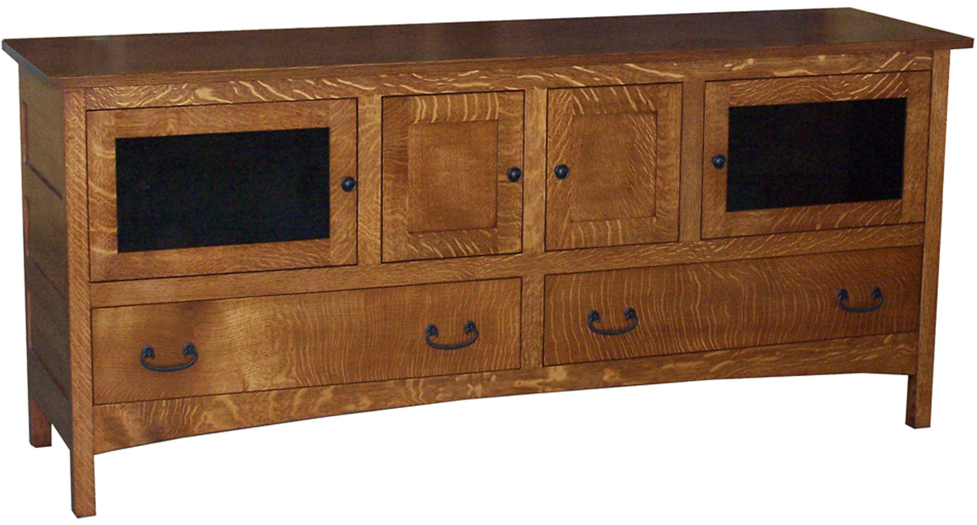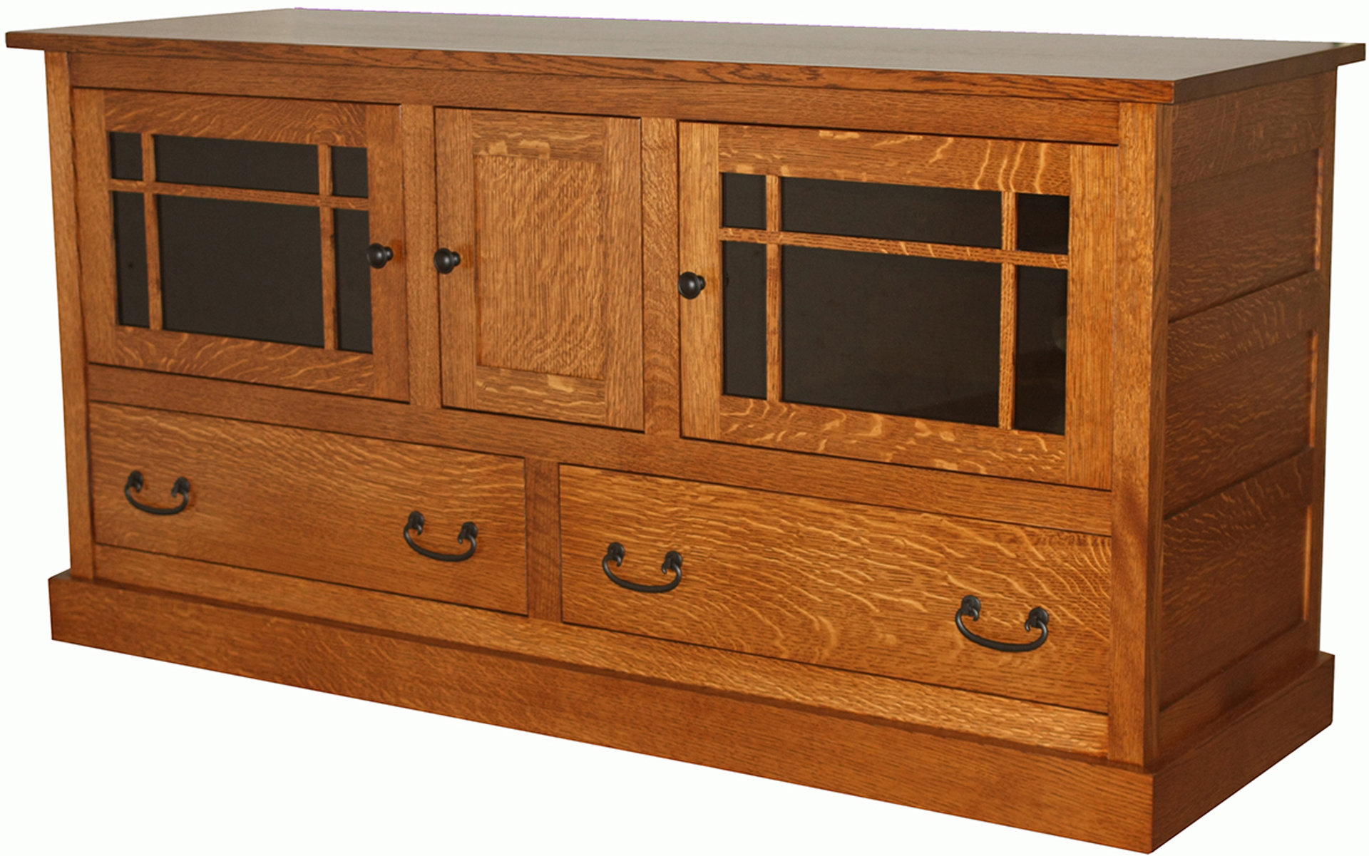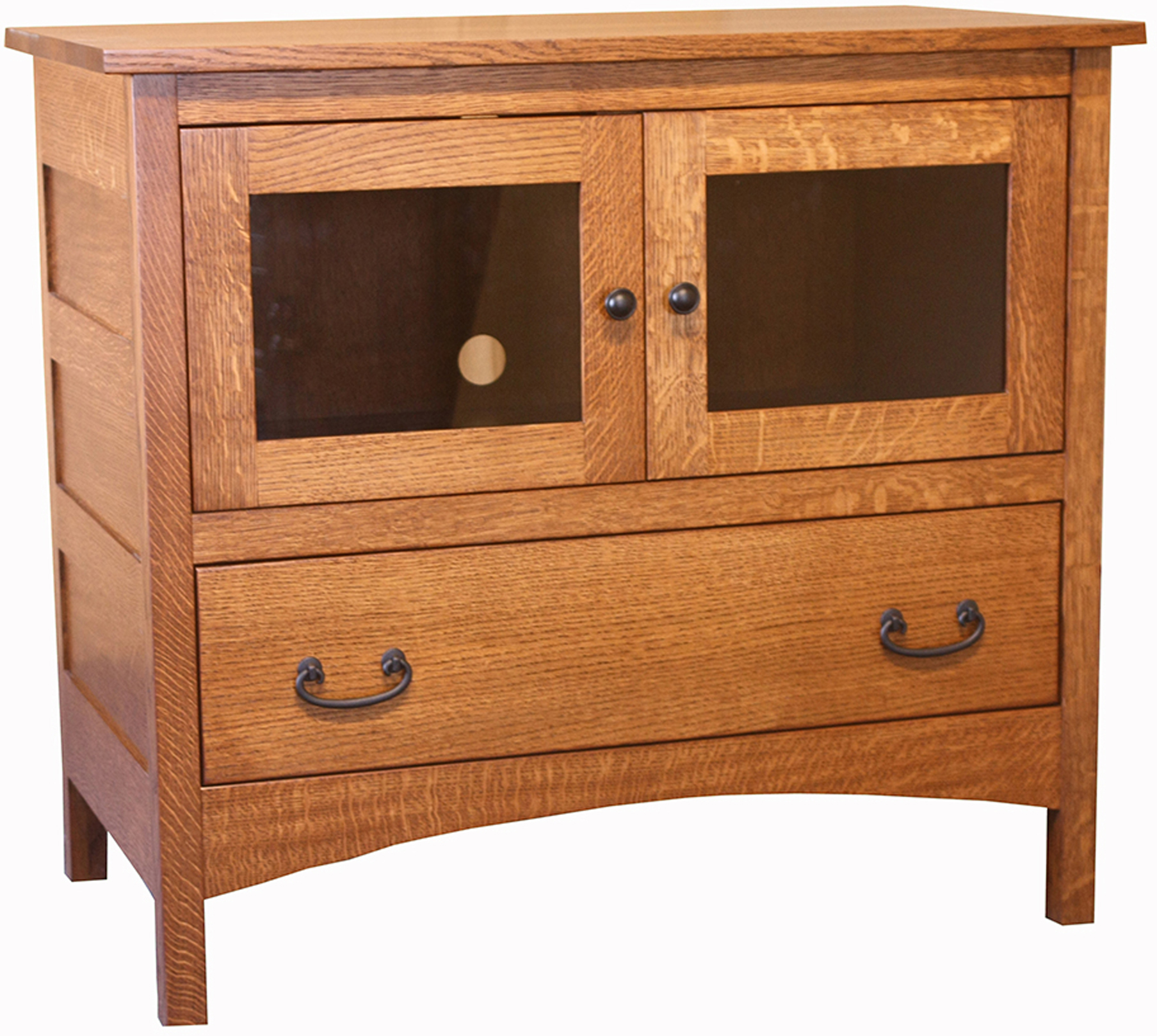 The Granny Mission Plasma TV Stands have beautifully paneled sides and smoked glass windows. You won’t have to worry about where you put it because it is appealing to the eye from every angle. The smoked glass doors will allow you to use your remote to control all of your components, while hiding their unsightly cords behind the closed doors. Opt to add mullions to the doors for even a little more style. This Granny Mission Plasma TV Stands comes in 38, 48, 60 and 72-inch sizes making it a great choice for any size room. Put it in a large great room with cathedral ceilings or in a smaller bedroom. The sky is the limit. All sizes are shown here in quarter-sawn white oak with Michaels cherry finish, but can be customized to meet your needs. If you prefer an enclosed base that is also an option you can choose.