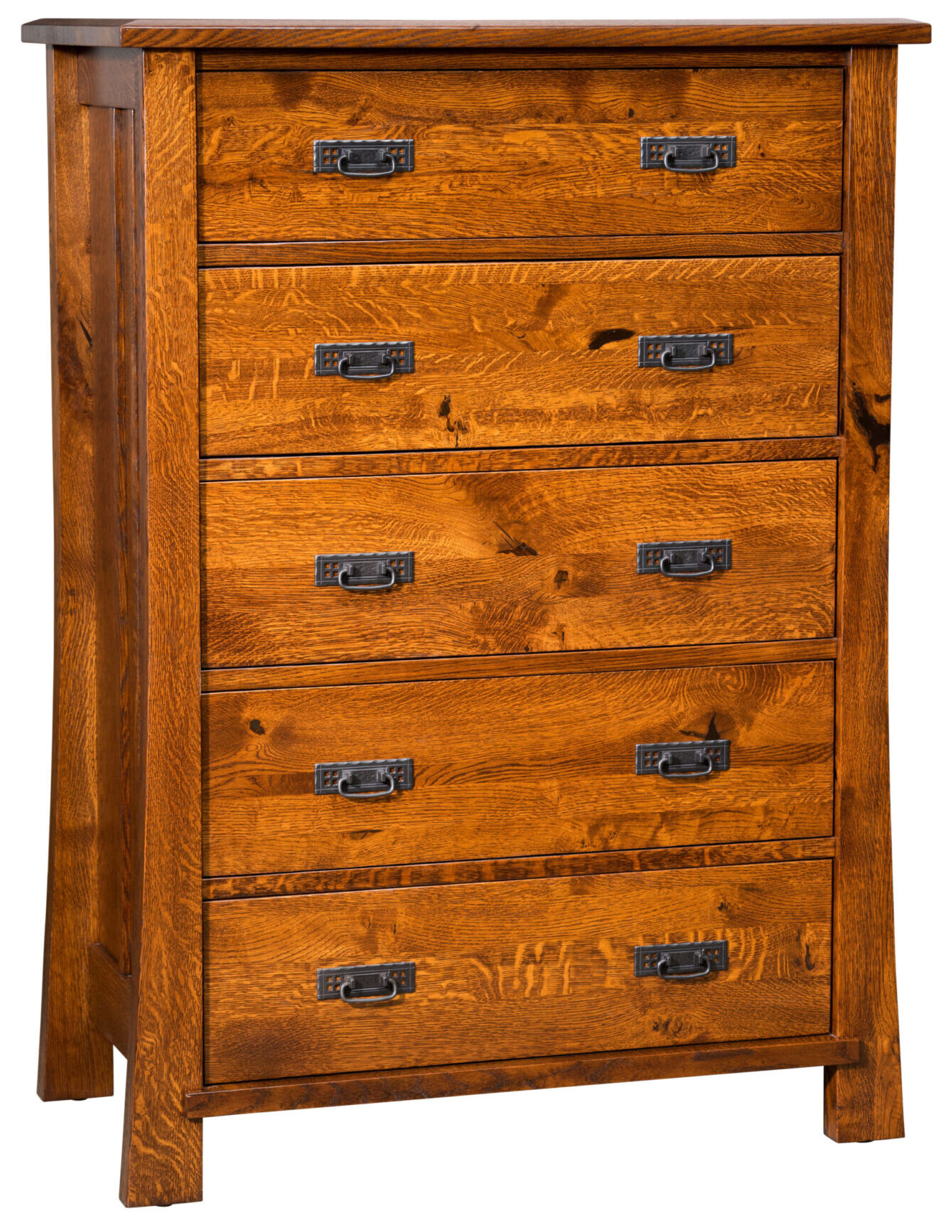 Stately Mission style with a modern edge meets huge storage space and user-friendly features. Welcome to the Grant Mountain Master Chest. You’ll like the clean lines, inset drawers and black Mission hardware. Plus the curved profile and flared feet. The five large drawers open the whole way. So, you’ll enjoy easy access to everything inside. Even items at the back. What’s more, the drawers close with a gentle push. While the dovetail joints enhance strength. Our Amish cabinetmakers handcraft the chest. And they use top regional hardwoods. Like maple, cherry and quarter-sawn white oak (shown). No wonder the chest is heirloom-quality! Now, make it yours. Simply complete the customizing fields below. Also, make sure you include your choices for wood specie, finish and more. Or call 855-768-3270.
