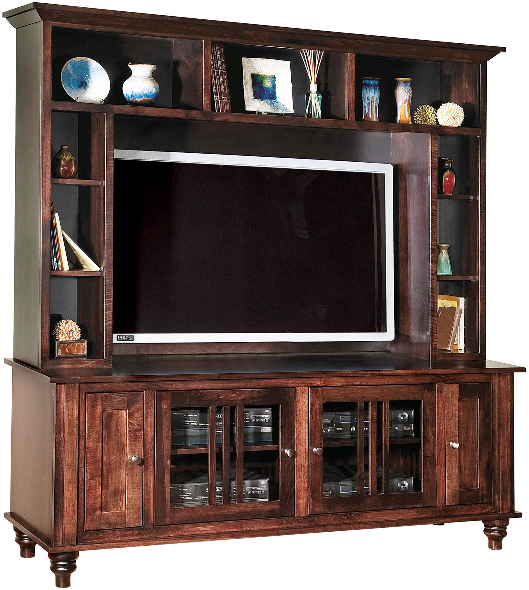 The TV area of the Harvest Cabinet and Hutch measures 50 1/2 inches wide by 34 3/4 inches high. And that’s large enough for most popular-sized large-screen TVs. Also, adjustable and fixed shelving in the hutch provides lots of space for your CDs, DVDs and/or books, figurines and keepsakes. Also, your DVD player, stereo and other entertainment center electronics will find a home behind the glass doors with mullion. You can request an optional power strip at the back of the console for hassle-free power hookup. Behind the panel wood doors are adjustable shelves and lots of additional storage space for your music and movie collections. Plus, all the doors come with a soft-close feature. So gently push an open door, and it slowly glides until it closes.