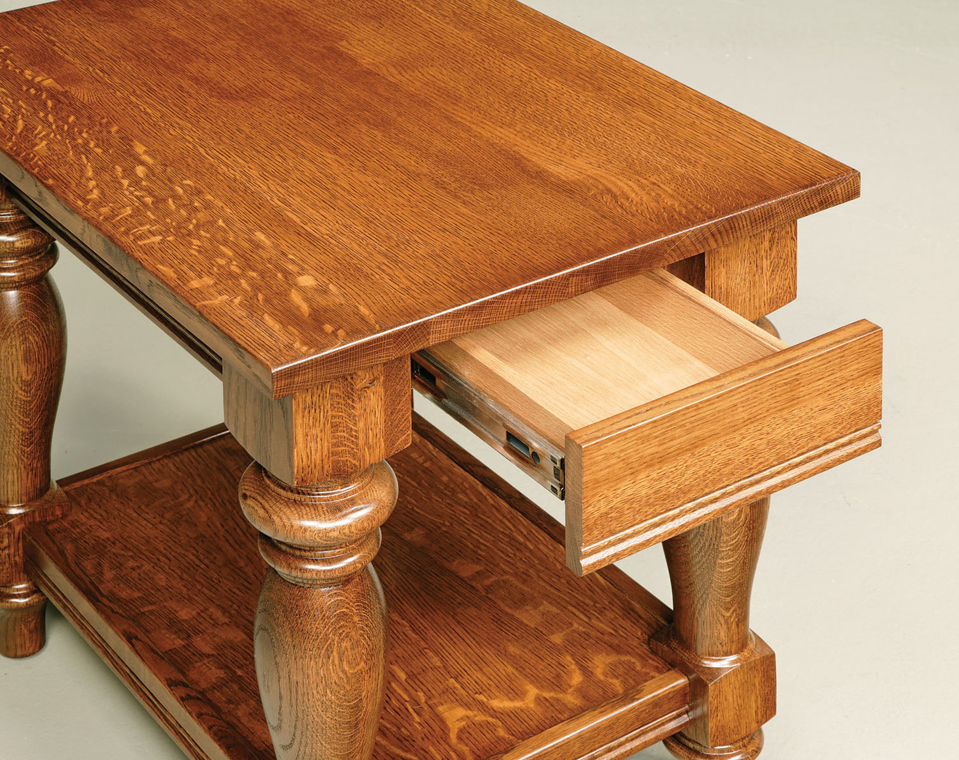 With its ornate turned legs and routing in the skirt and bottom shelf, the Harvest Collection End Table makes quite a statement! Also, we hide a drawer at one end of the table. And the drawer opens full extension. So you’ll enjoy easy access to everything inside. Even items at the back. While the contents are out of sight and out of mind. Our Amish artisans handcraft the end table. Also, they use quality regional hardwoods. Such as oak (shown with Michael’s Cherry Stain). The 1-inch-thick, solid hardwood top exemplifies the quality of the Harvest Collection End Table. No wonder the table is so sturdy. Beautiful. Also heirloom-quality! Now, make it yours. Simply complete the customizing fields below. Also, make sure you include your choices for wood species, finish, and more. Or call 855-768-3270.