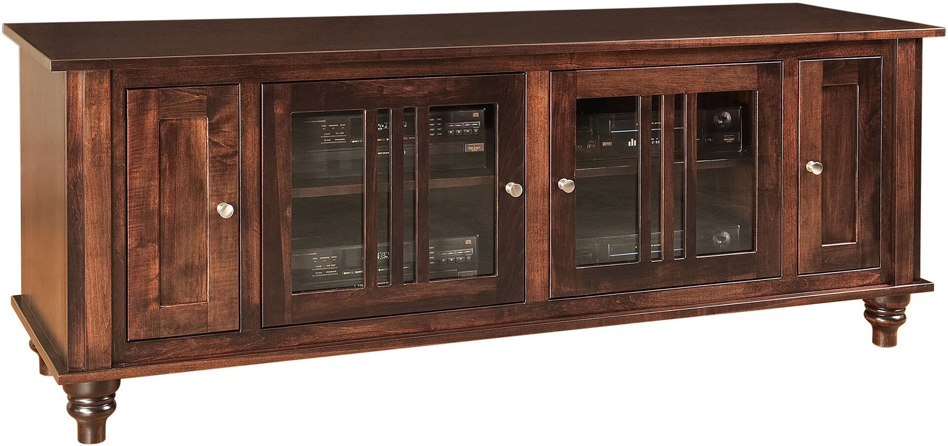 Wide, sleek and eye-catching, the Harvest TV Stand adds a sophisticated look to your living room or den, plus the reassurance of excellent value that comes with owning an Amish custom-built, solid hardwood piece of furniture. Notice the turned ‘Harvest’ feet. Plus the flush doors with recessed wood panels and mullioned glass doors. And these features beautifully contrast with the shiny round knob hardware.