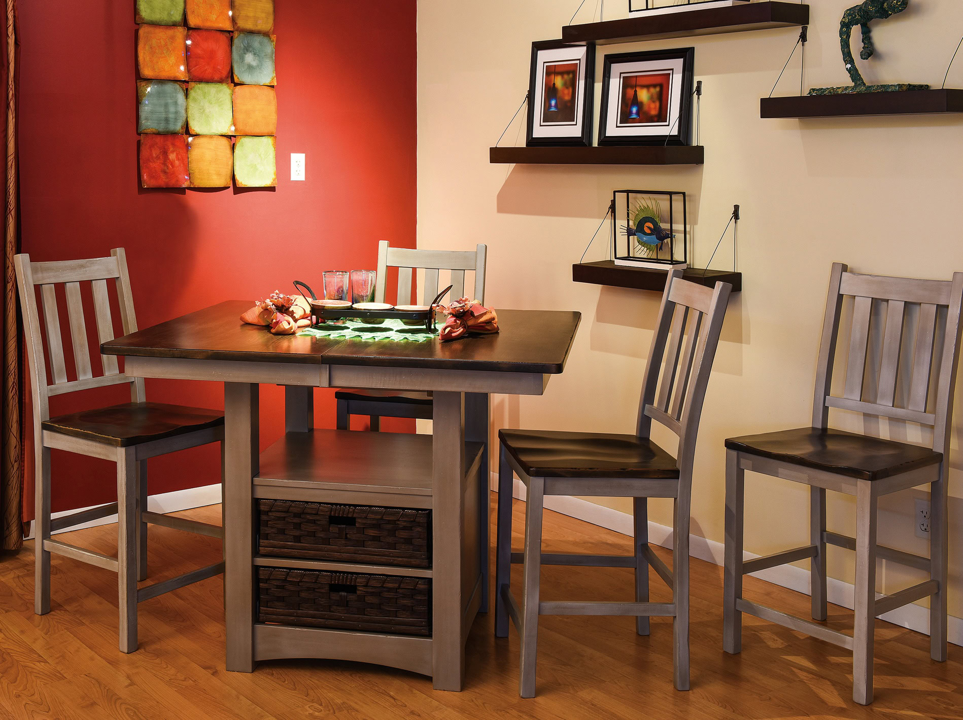 This Heidi Cabinet Table Dining Set includes the Heidi Cabinet Table and Denver Chairs. This set is the perfect combination of style and functionality. The table’s two drawer baskets with soft-close slides provide great storage. So, place your extra table linens, holiday décor or even the kids’ crayons and coloring books in these baskets. There are five different table sizes to choose from. Additionally, you can opt for a solid wood top, one 12-inch leaf or one 18-inch butterfly leaf.