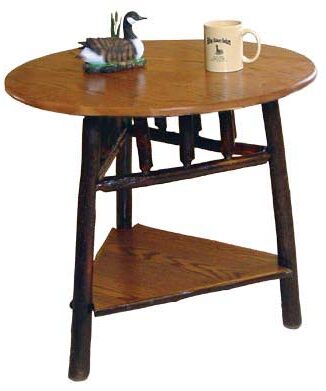 Solid construction and a unique triangle shelf highlight the Hickory Round End Table with Triangle Shelf.