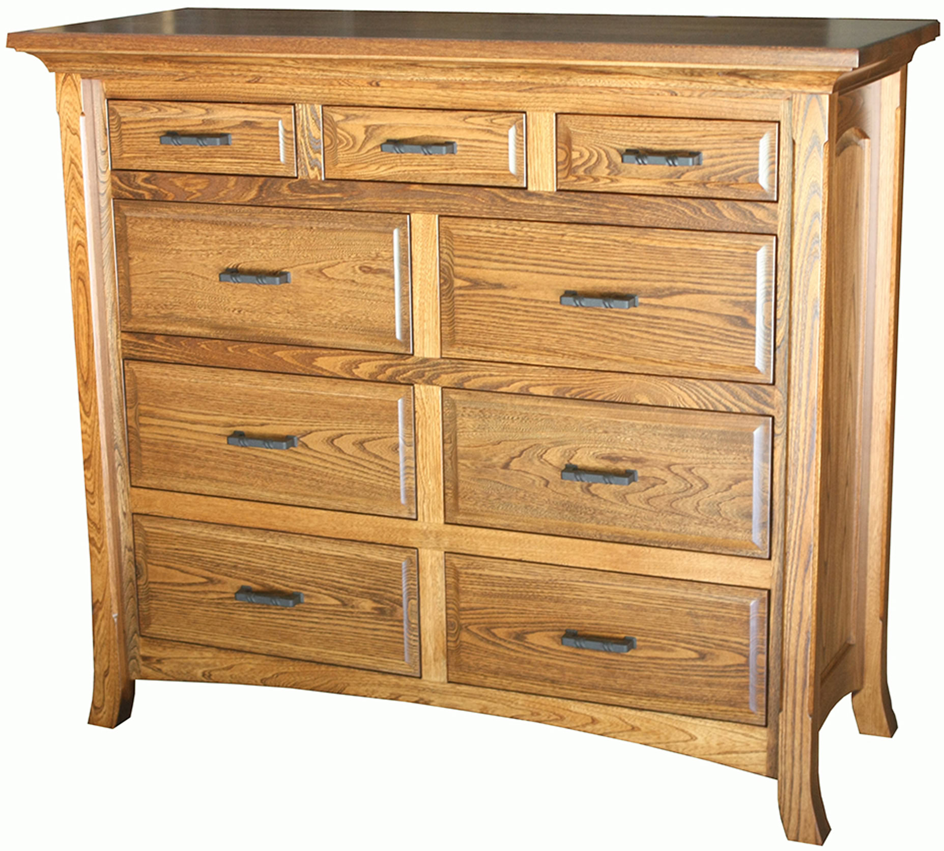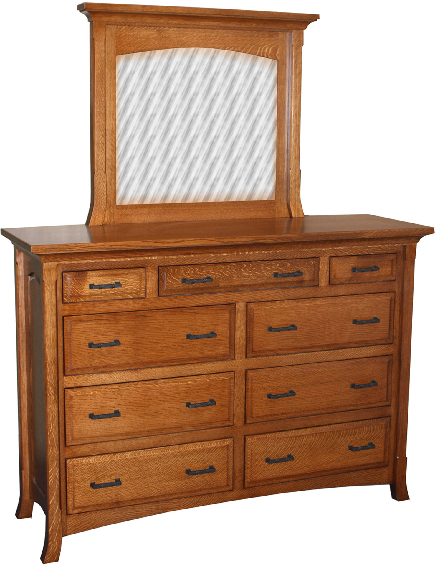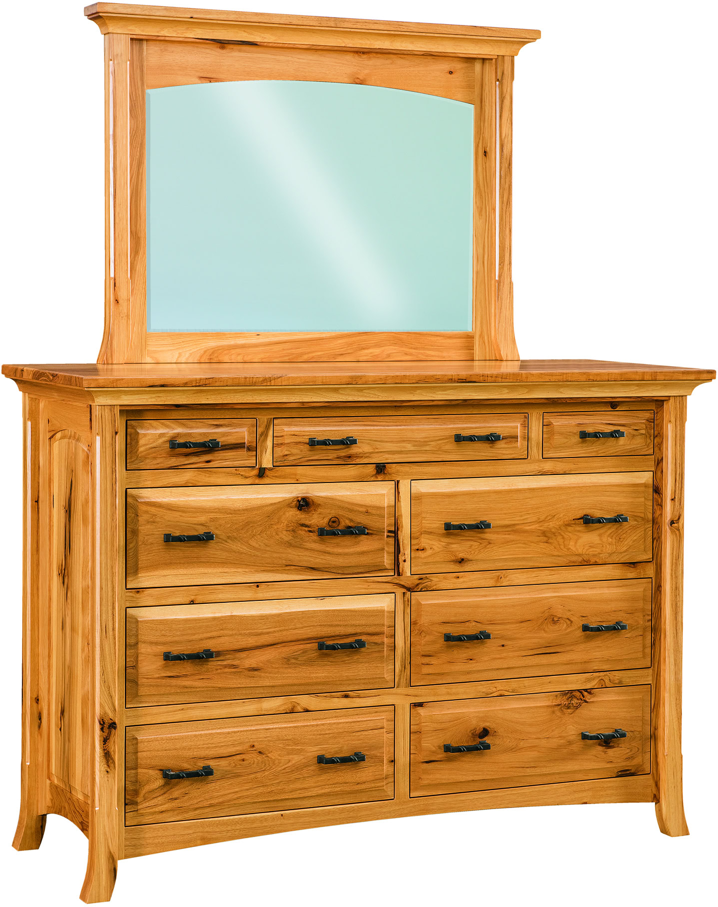 Big on storage, giant on style and pizzazz. That’s the Homestead Nine-Drawer Mule Dresser. The raised panel sides and curved feet catch the eye. So does the rustic hickory wood with Wheat stain. Also the beveled mirror. And solid pull hardware. In addition, the drawers open full-extension. So you’ll enjoy easy access to everything inside. Even items at the back! While the dovetail drawer joints excel in strength. Amish cabinetmakers build each Homestead Nine-Drawer Mule Dresser. So the chest is heirloom-quality! Now, make it yours by completing the customizing fields below. With your choices for wood specie and finish. Also the large or small-size dresser. Or call 855-768-3270.