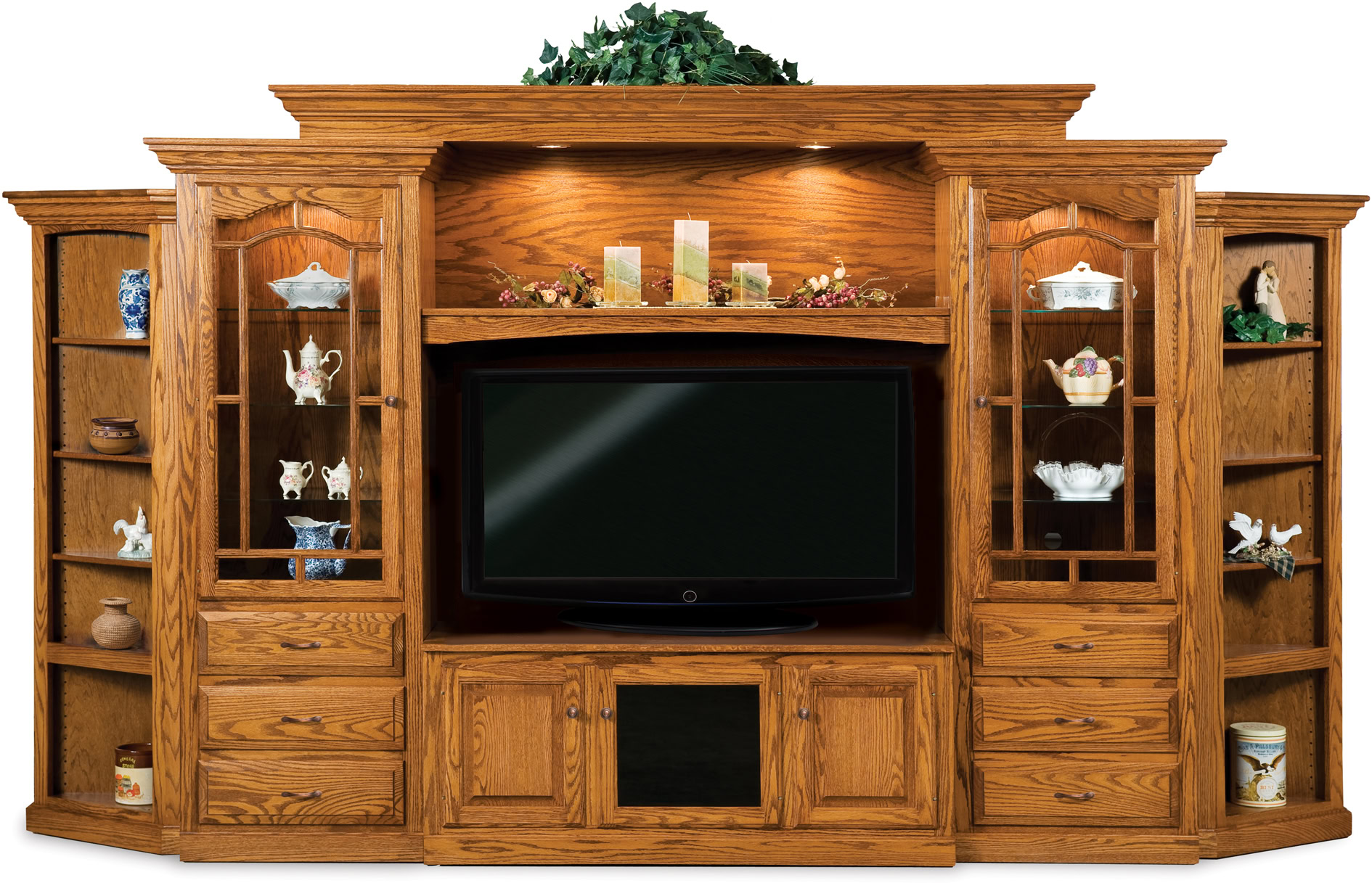 You get an adjustable shelf above the TV. Plus six glass shelves in the side cabinets. That’s a lot of space to show off your keepsakes. And dimmable LED touch lights keep them illuminated. Also, we carved out more storage space behind the three console doors. Plus three adjustable shelves. So you’ll have ample room for your electronic equipment. In addition, the six drawers open full-extension. This gives you enjoy easy access to everything inside. Plus, dovetail joints enhance strength. And a soft-close feature comes standard on the doors, optional on the drawers. Just give the doors or drawers a gentle push. And they close automatically. If all of that space isn’t quite enough, you can add a DVD/Media component area or corner side cabinets as well.