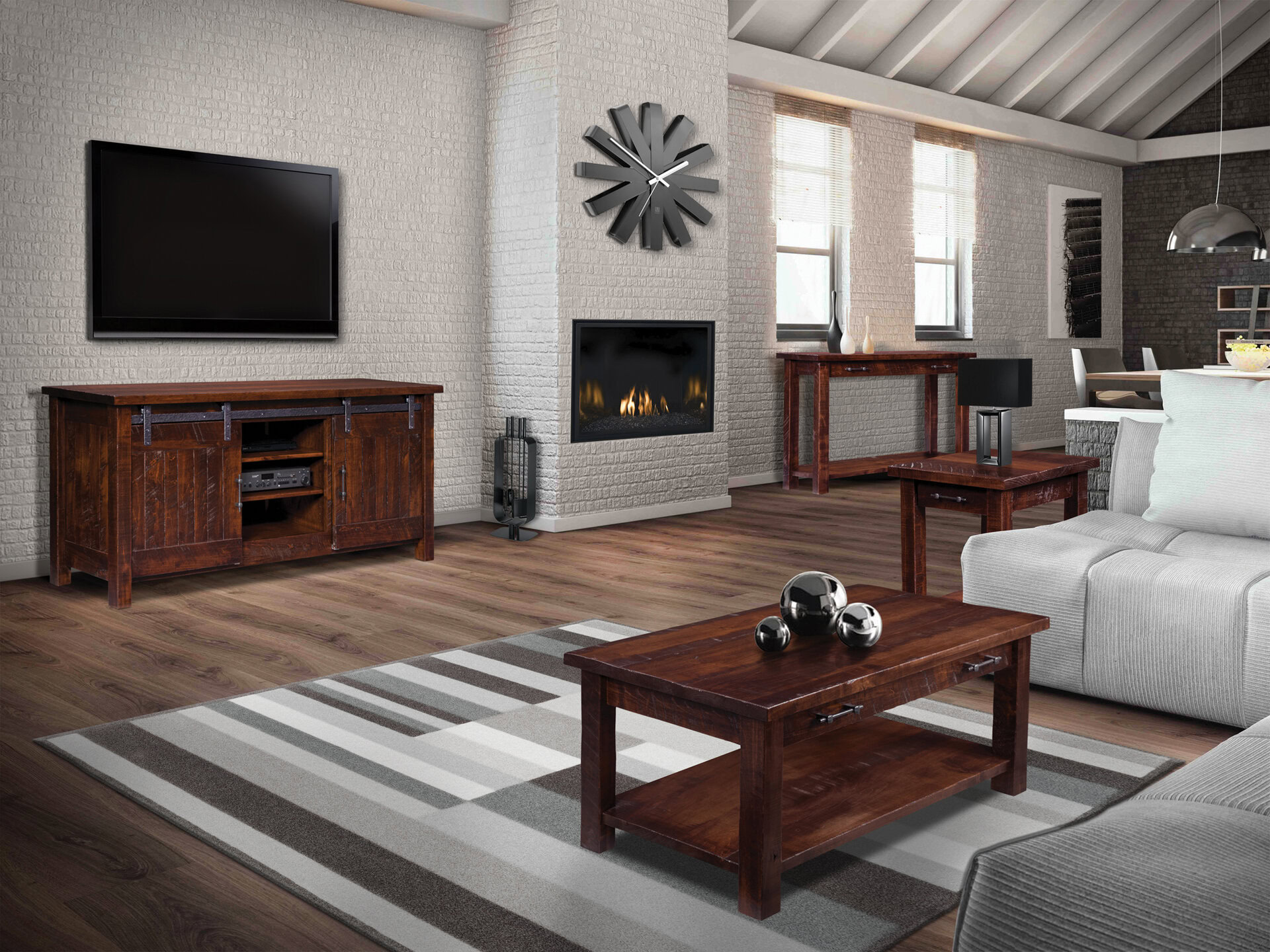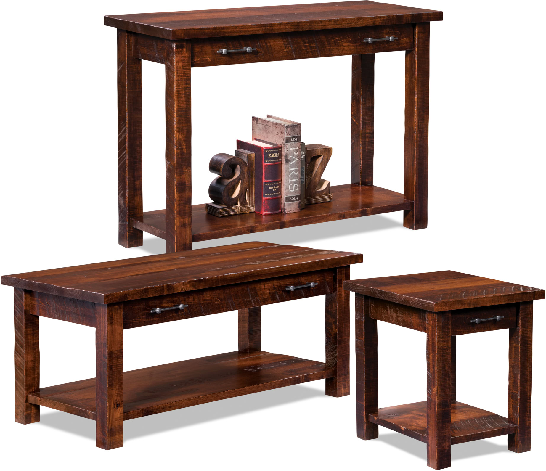 The Houston Collection also offers a matching coffee table and sofa table. So, you can create a complete, cohesive look for your space. The rough sawn Rustic Brown Maple wood is unique and will be a stunning feature in your home.